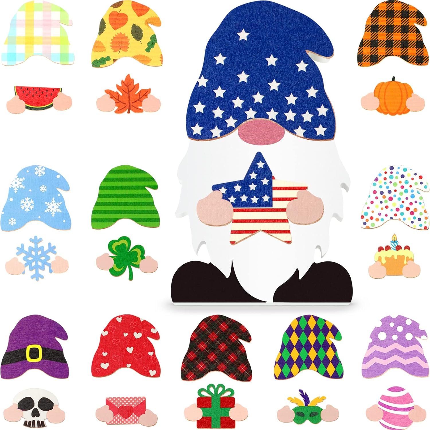 Jetec 24 Pcs Interchangeable Wooden Gnome Summer Patriotic July 4th Gnome Decor DIY Fall Harvest Holiday Seasonal Tiered Tray Decoration with Detachable Magnet Pieces