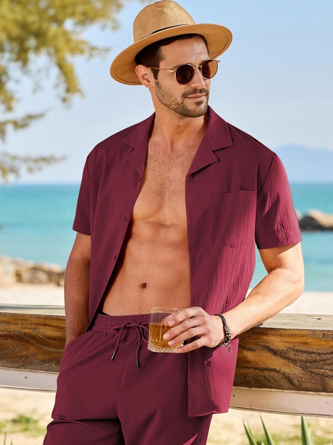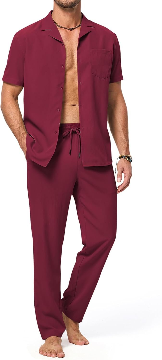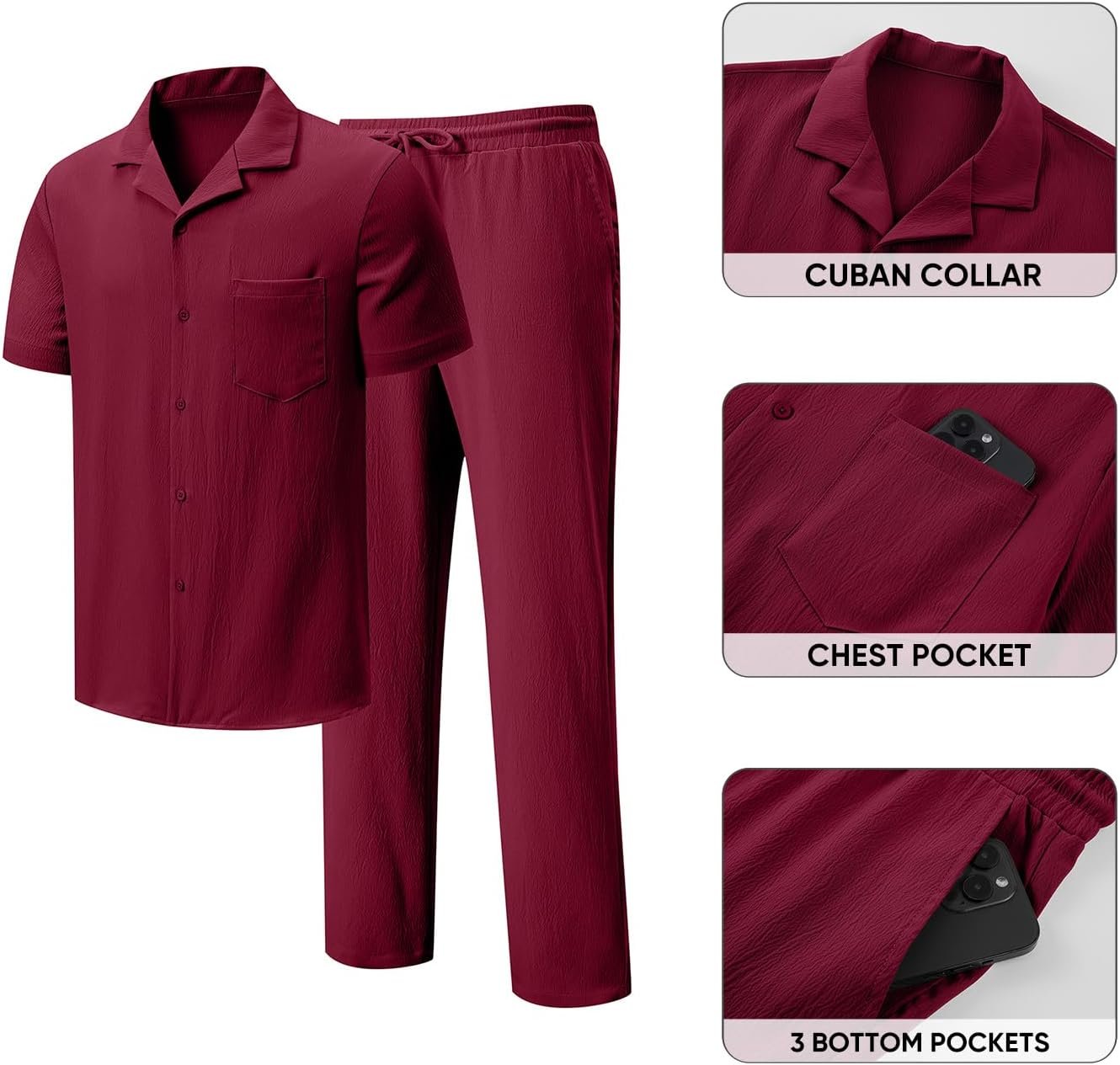 JMIERR Men 2 Piece Outfit Short Sleeve Beach Button Down Shirt Casual Loose Pant Sets with Pocket