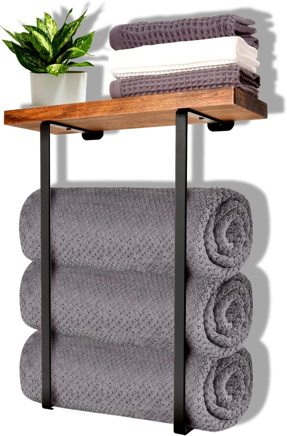 ⭐【Towel Rack with Wooden Shelf 】Towel rack can hold at least 3 extra large size(30’’x60’’) fluffy nice towels. It can hold up to 50 pounds. The towel racks for bathroom wall mounted with Wooden Shelf. You can store towels separately as needed. stylish of the wall mount towel storage upgrade decorative touch to bathroom decor.