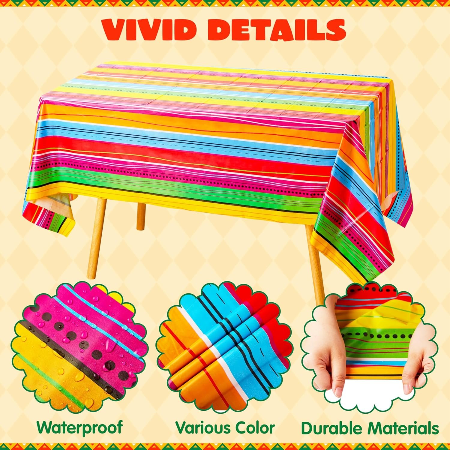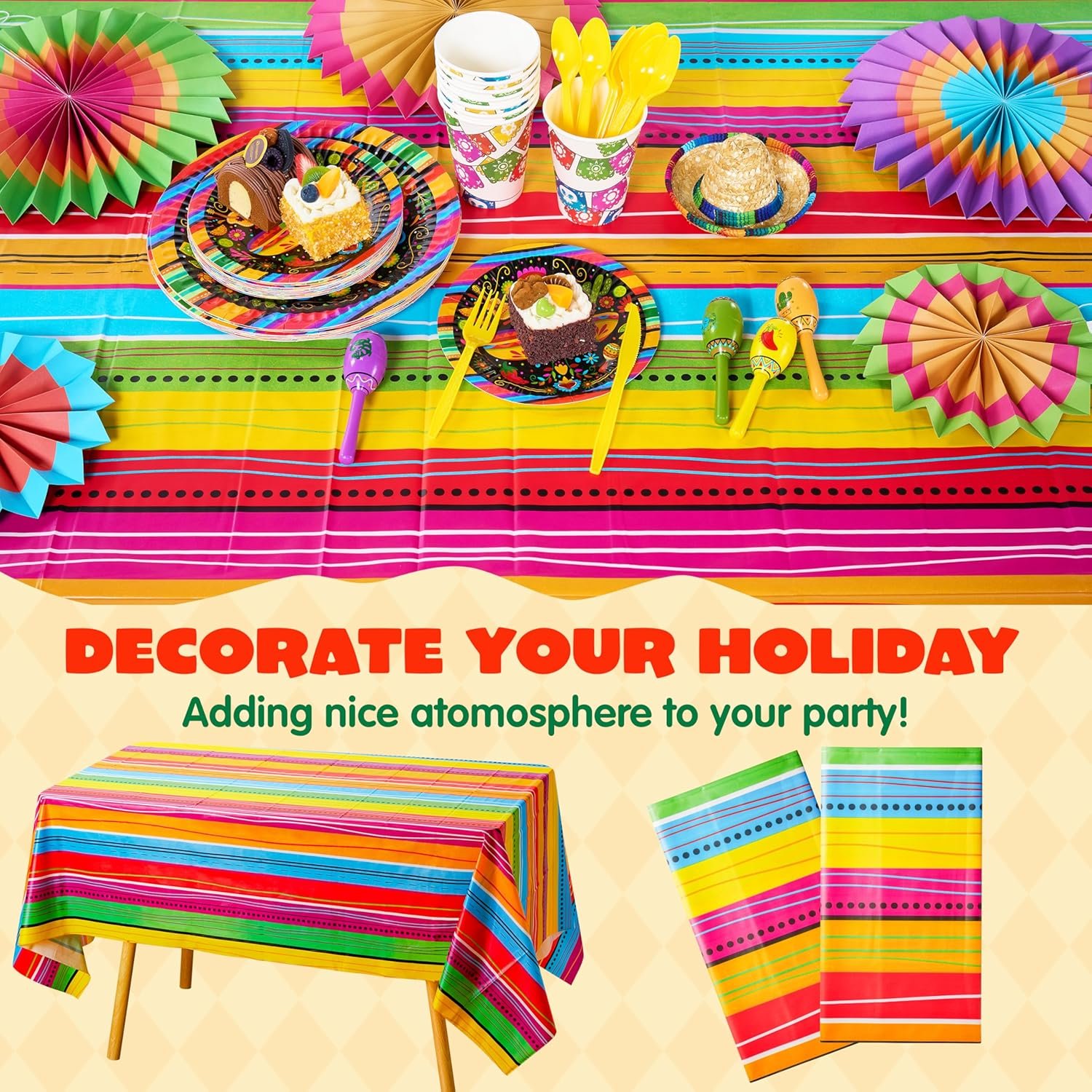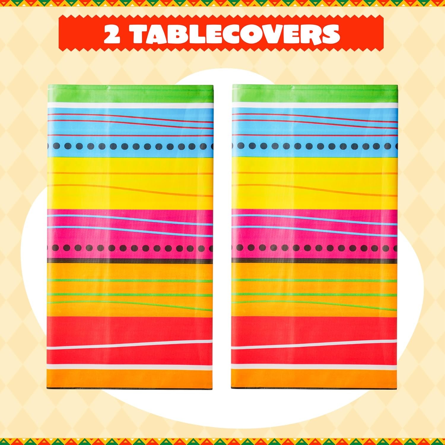 SUPER VALUE PACK. Our Decorative Print Plastic Tablecover includes 2 pieces of Stylish Mexcian Styles stripe with decorative all-over print design tablecover. Size: 54″ width x 108″ length.