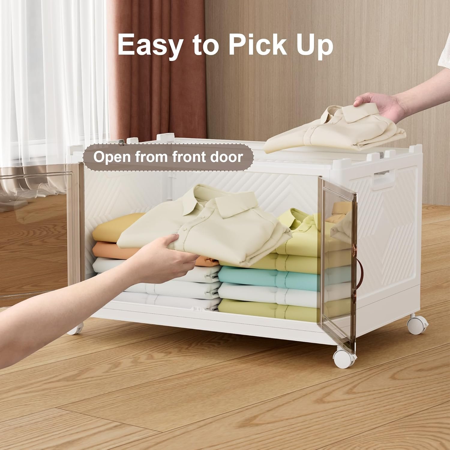 [Easy to Move] The collapsible storage box is made of high-strength PP material, which is very durable. Four rotating wheels are installed at the bottom, so that it can move when cleaning, more convenient for you to clean