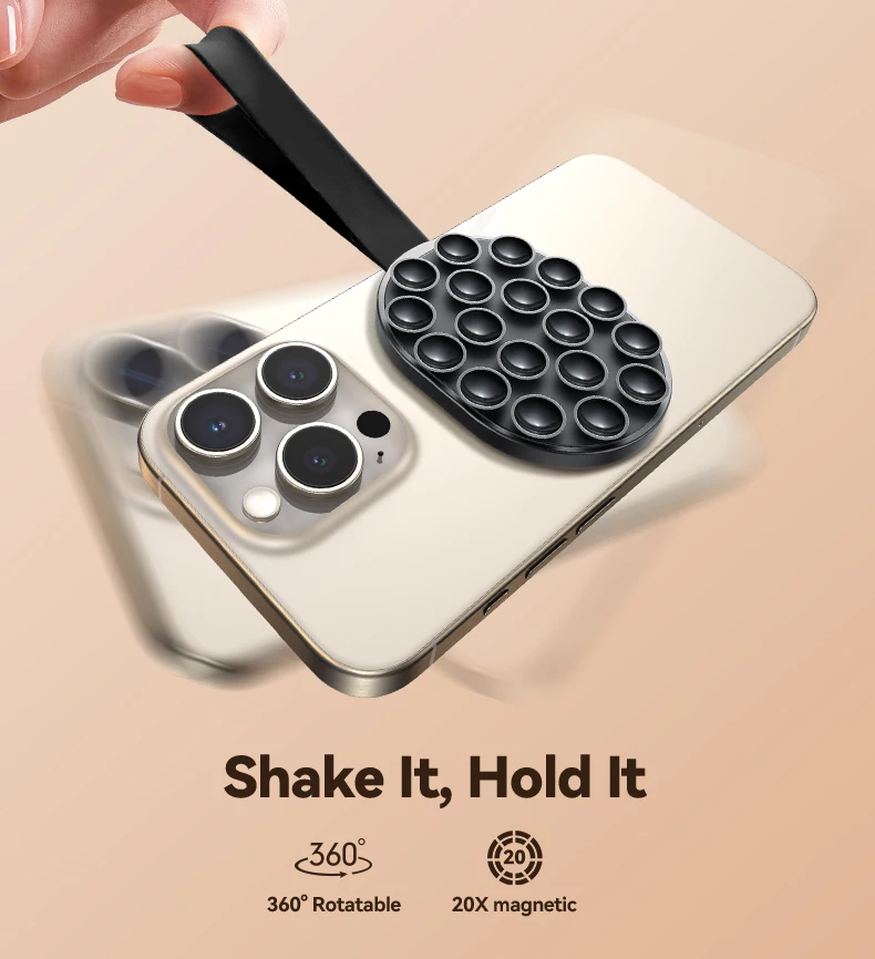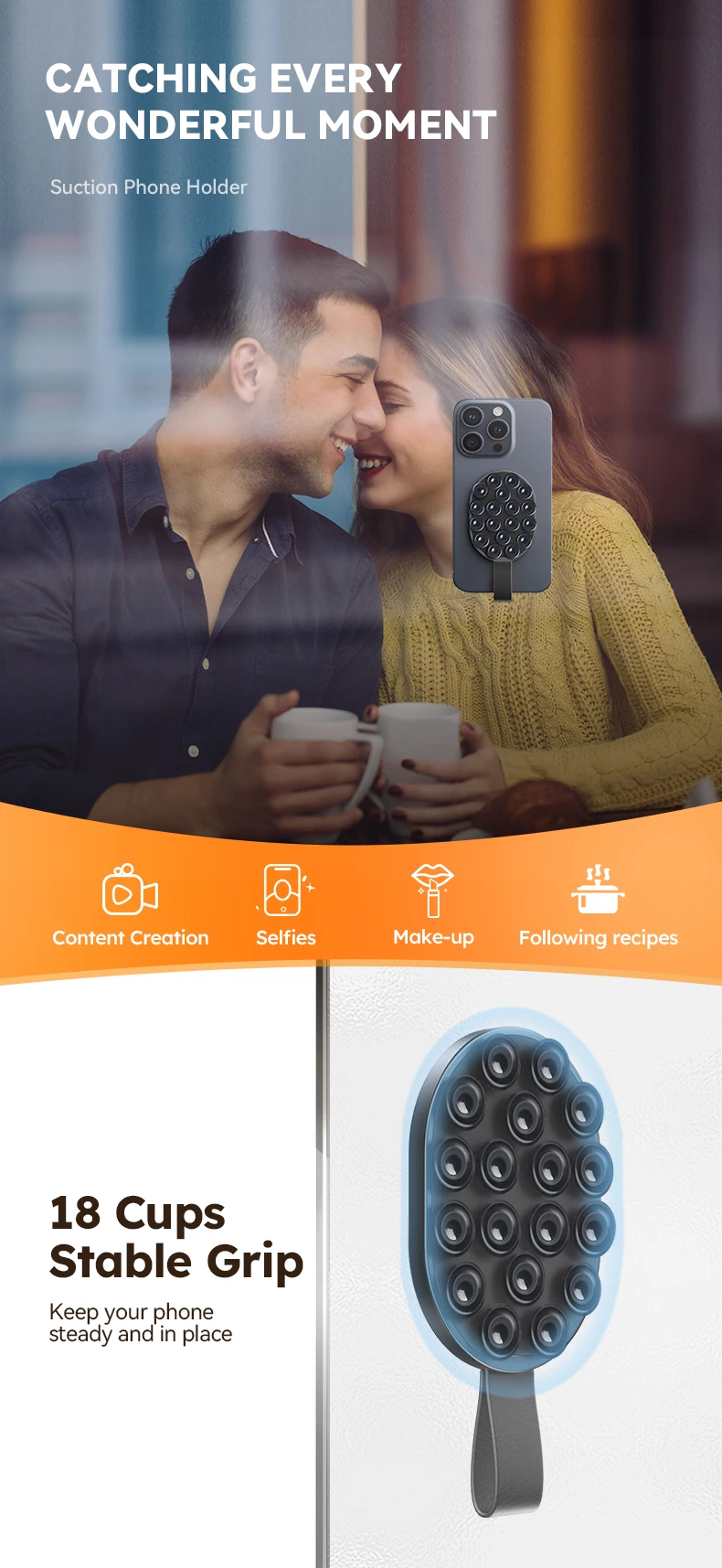1.Upgraded Magnetic Suction Mount:Designed for Various types of phones, magnetic suction cup phone mount can be attached to any smooth surface likeglass, marble, steel, metal, ceramic and plank. Ensuring a firm grip on the device when taking photos, videos, chatting, watching movies, letting you free your hands anytime, anywhere!