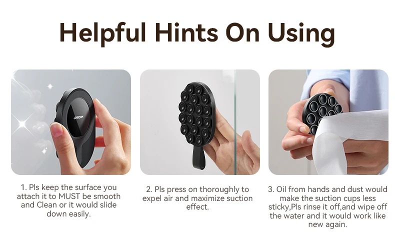 2.Incredibly Strong Suction on Slick Surface:Joyroom magnetic suction cup phone mount has 18 strong suction cups each 7.5mm in diameter, which provides a strong and stable grip. You never have to worry about your phone slipping or falling while using. This mount always keeps your phone steady and in place. (Pls press on the suction holder thoroughly to expel air and maximize suction effect.)