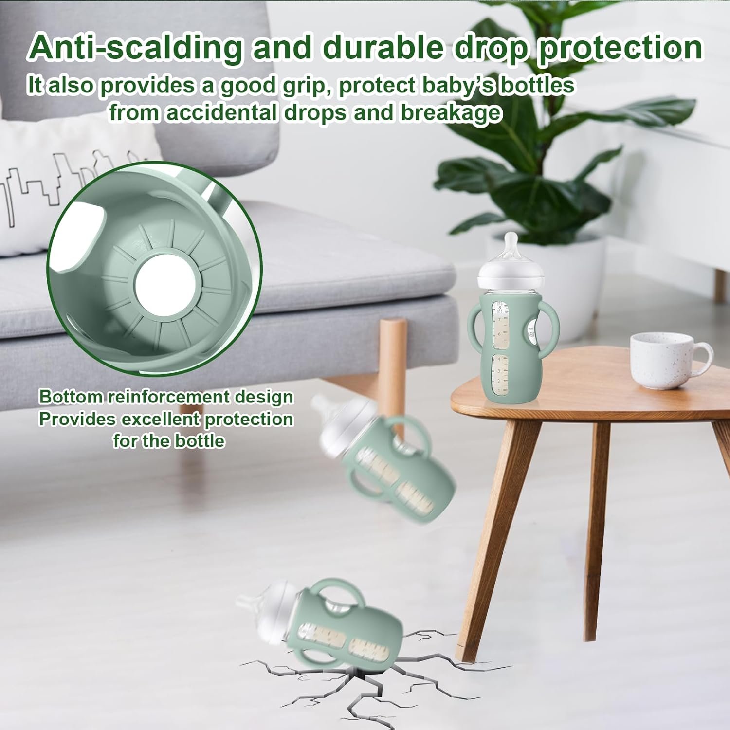 Drop protection : Silicone bottle sleeves provides excellent protection for the bottle, bottom with reinforcement design, give that extra cushion in case the glass bottles fall, protect baby’s bottles from accidental drops breakage. It also anti-scalding if the glass is a little warm from heating up formula or milk