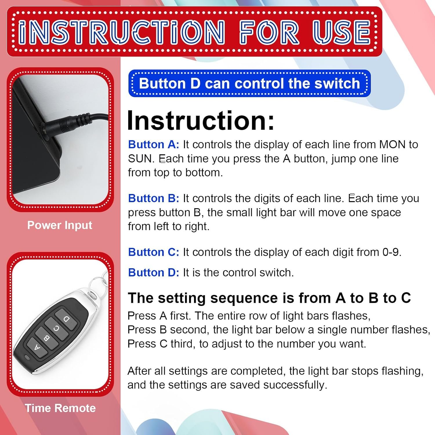 Programmable Business Hours: Press D to open, and easily program business hours in 30 minute increments; And the open sign comes with setup instructions, see product description for details