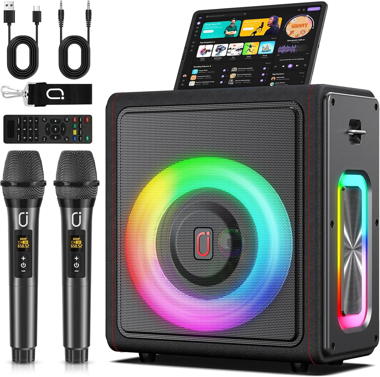 Karaoke Machine, Portable Bluetooth 5.3 Speaker with 2 Wireless Microphones for Adults, PA System with Pitch Correction & Echo Adjustment, Supports TWS/TF Card/USB/AUX/Live/REC for Home Party