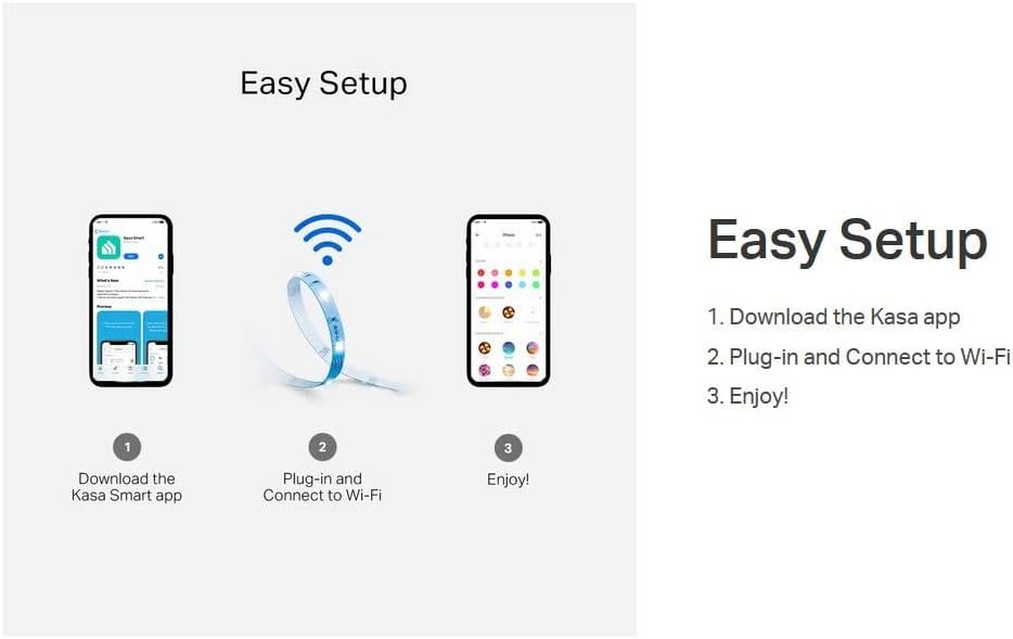 Paint your home in endless colors with Kasa Smart multicolor light strip. Transform your home into the ultimate entertainment destination with LED strip light features 16 million colors with high brightness & saturation to suit every mood and scene, and take control of your light strip with just your voice or Kasa App. Important Information: This device complies with part 15 of the FCC Rules. Operation is subject to the following two conditions: (1) This device may not cause harmful interference, and (2) This device must accept any interference received, including interference that may cause undesired operation.
