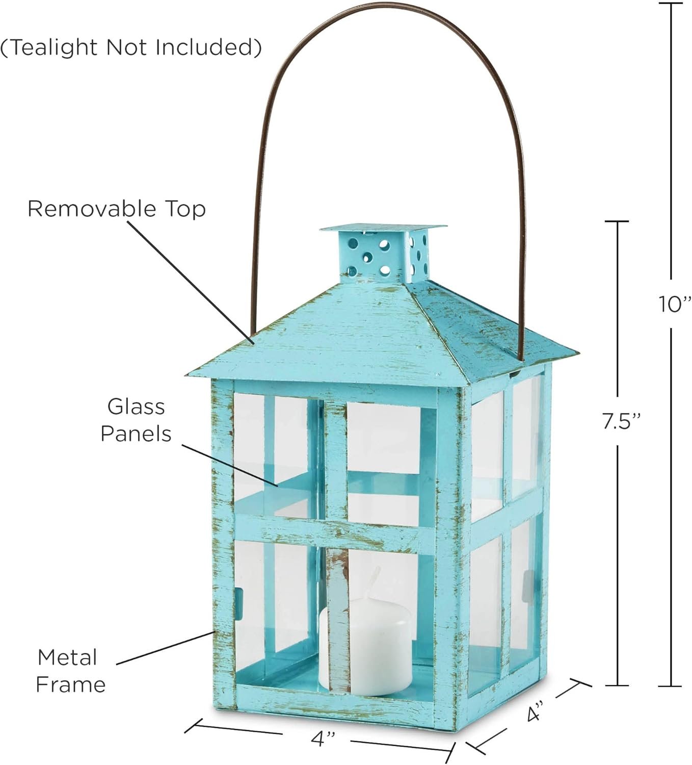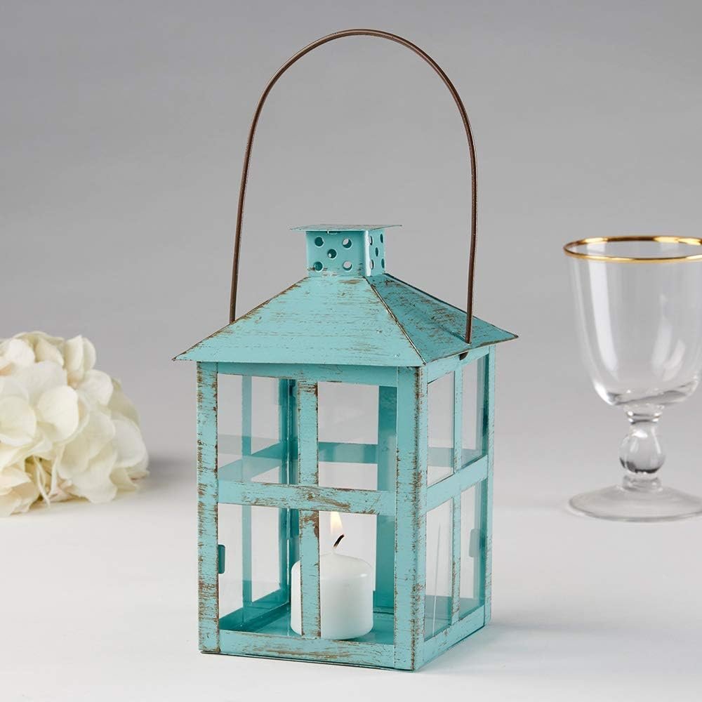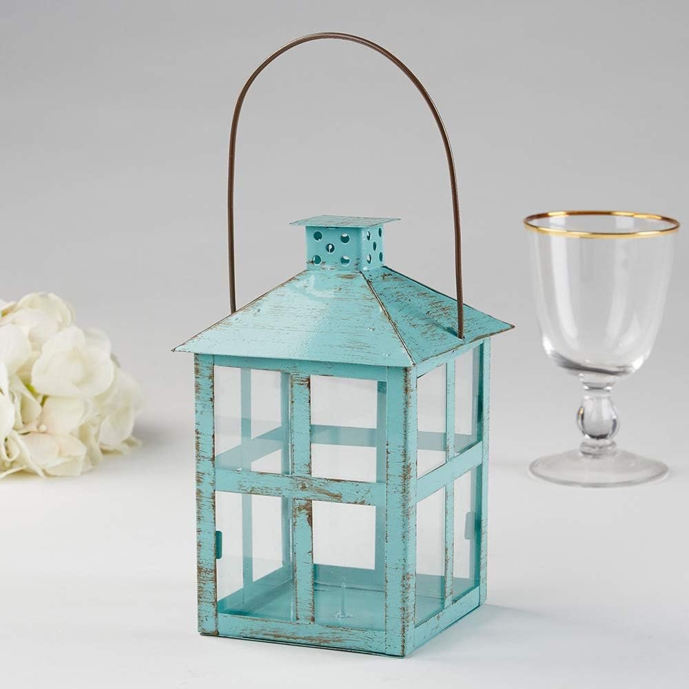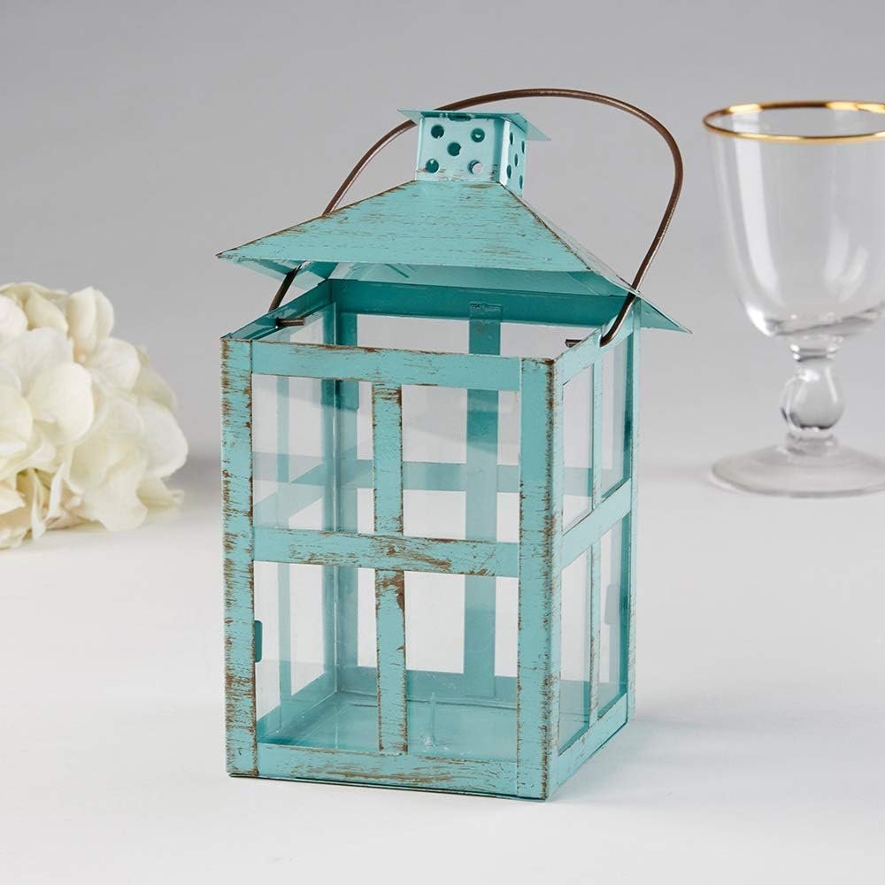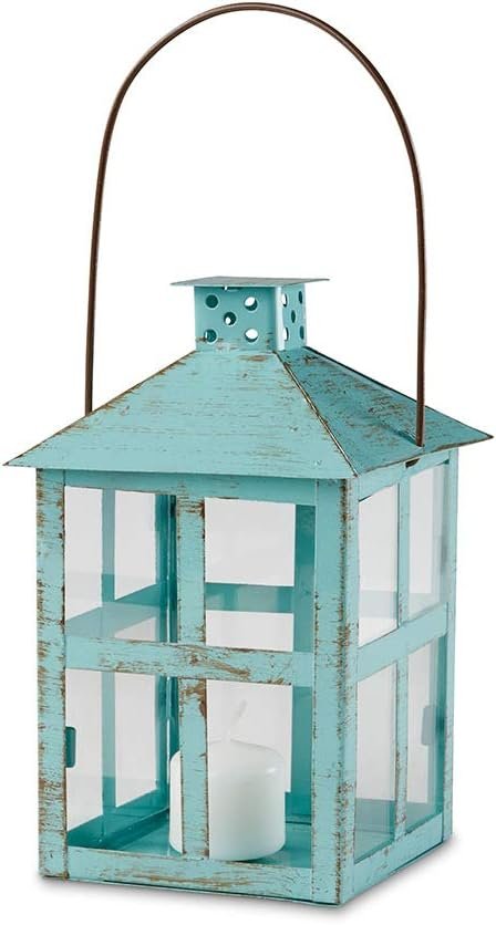 Vintage inspired – rustic Blue metal lantern with vintage distressed details; glass windows and metal wire swing handle. Pair multiple lanterns or with different size and color Kate Aspen lanterns for a custom look.