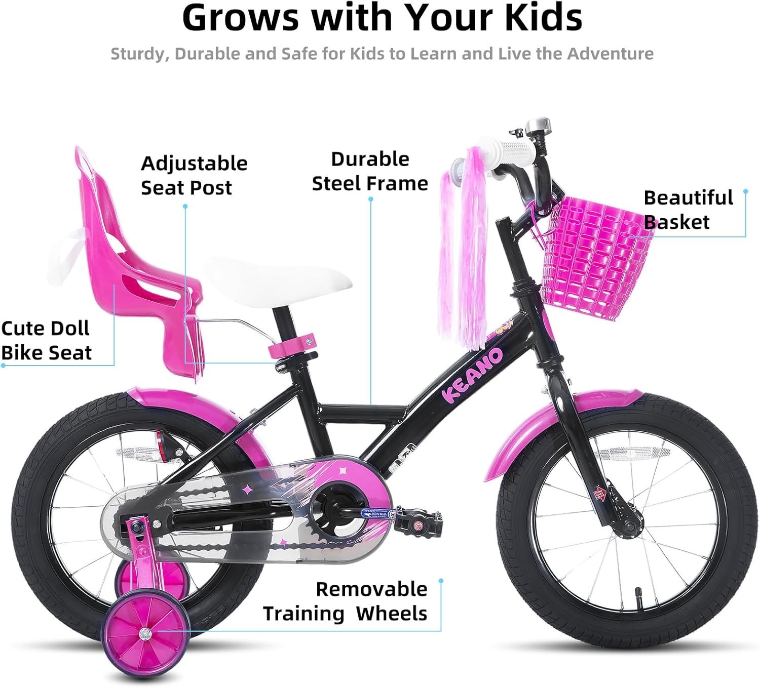 Elegant Design for Kids – The KEANO Zinnia Princess 14 Inch Girls’ Bike comes with a doll bike seat, an cute basket, and charming streamers. They turn each ride into a wonderful journey, making it highly appealing to young girls at first sight