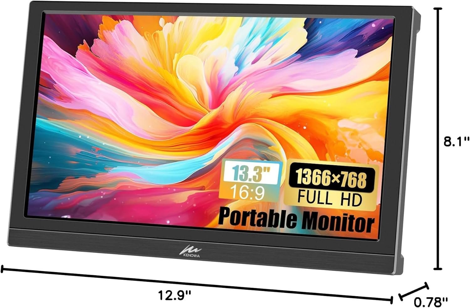 Kenowa Portable Monitor 13.3 Inch HD 1366x768P LED Screen Small HDMI Monitor Built-in Speaker and Adjustable Stand HDMI VGA Port, External Display for Laptop PC Mac Xbox PS4/5