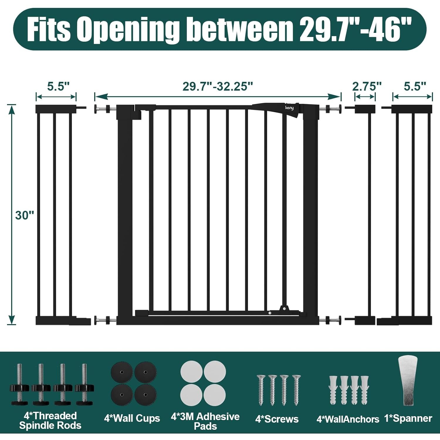 keny 29.7″-46″ Baby Gate for Stairs, Auto Close Dog Gates for Doorways, Pressured Mounted No Drilling Pet Gate Extra Wide, One-Hand Opening Dual Lock Stair Gate, Indoor Kids Necessities, Black