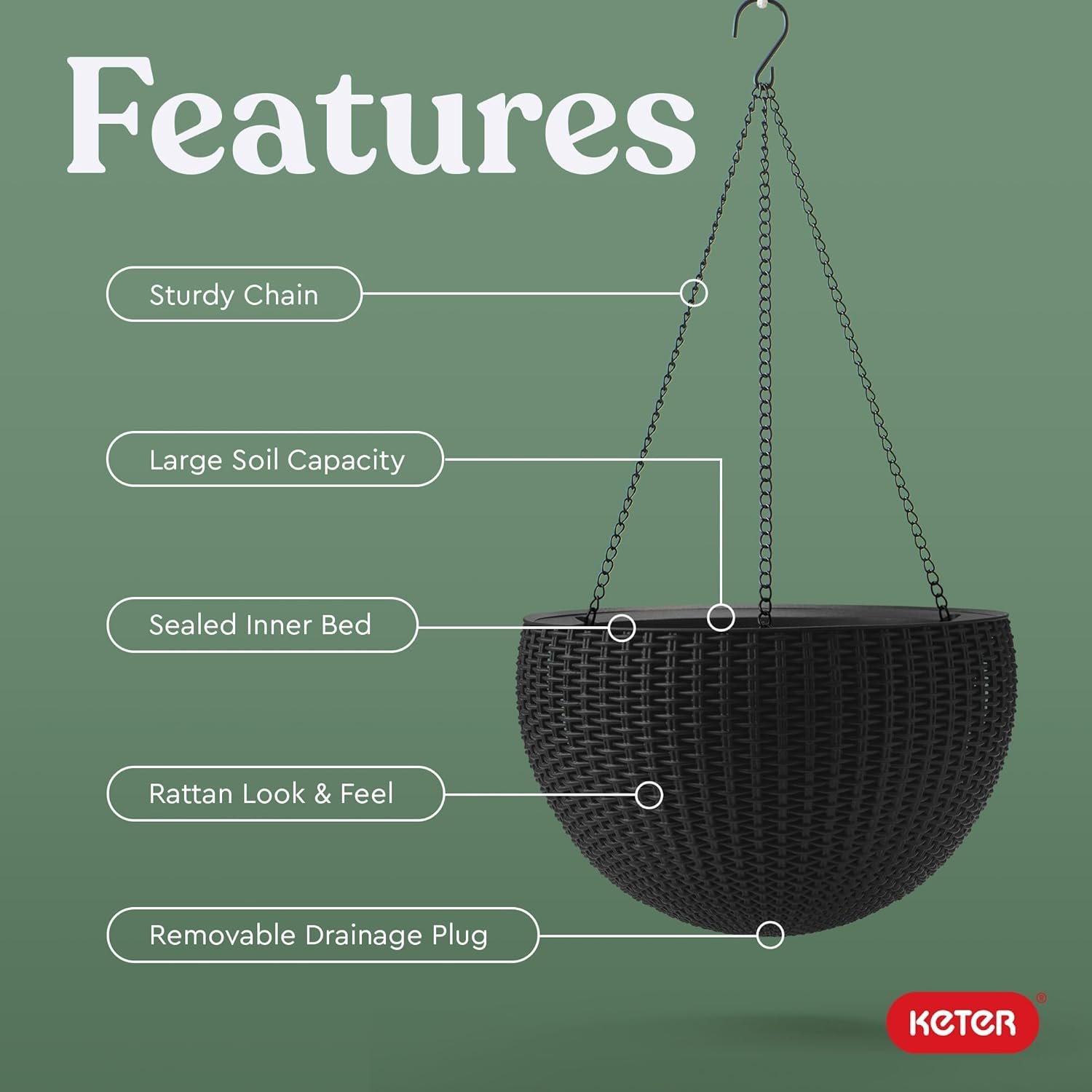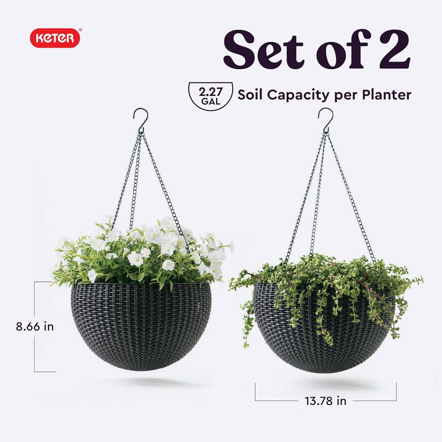 Keter Resin Rattan Set of 2 Round Hanging Planter Baskets for Indoor and Outdoor Plants-Perfect for Porches and Patio Decor, Graphite