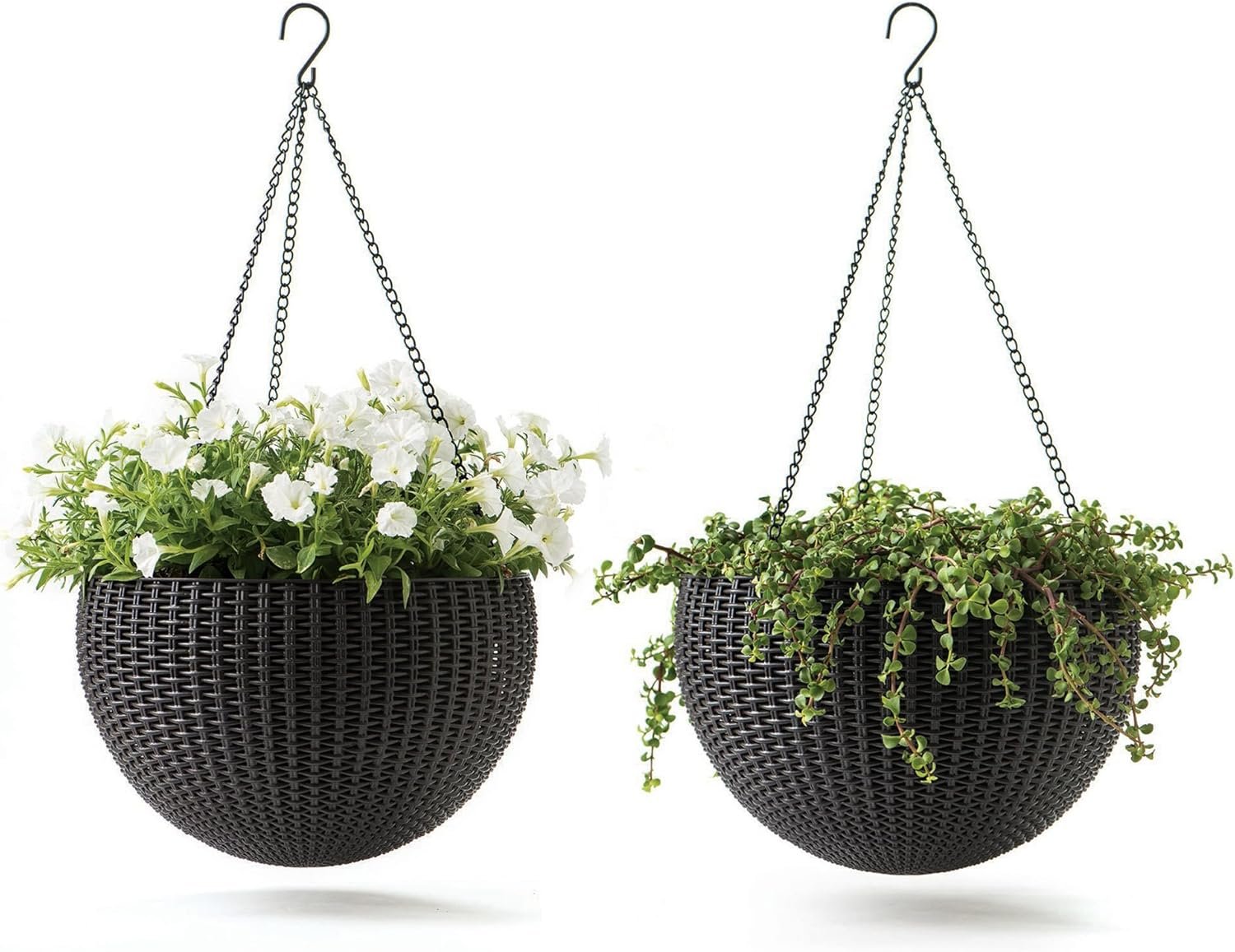 You’ll love the eye-catching wicker-style design of these attractive planters, and you’ll appreciate their exceptional resilience and durability. Unlike real wicker, these pots are made out of polypropylene resin that’s designed to look almost exactly the same. It even has the same texture, so anyone who sees them is likely to believe they’re actually made out of rattan. However, the resin ensures that they won’t peel, fade, stain, unravel, dent or rust. Feel free to keep them out in the blazing sun or otherwise exposed to the elements. They will keep looking terrific the whole while. Key Features: Durable polypropylene resin construction means no rusting, peeling, denting, fading, staining or unraveling Measures 13. 78″ wide by 13. 78″ deep by 8. 66″ high Attractive woven look and texture that’s remarkably similar to real rattan Sealed inner bowl and drainage plug allow for indoor or outdoor use Iron with black finishing-chain hanger and hook withstands the elements while providing secure support Decorative brown woven-look finish Rounded design makes them an attractive addition to any part of the home – indoors or outdoors