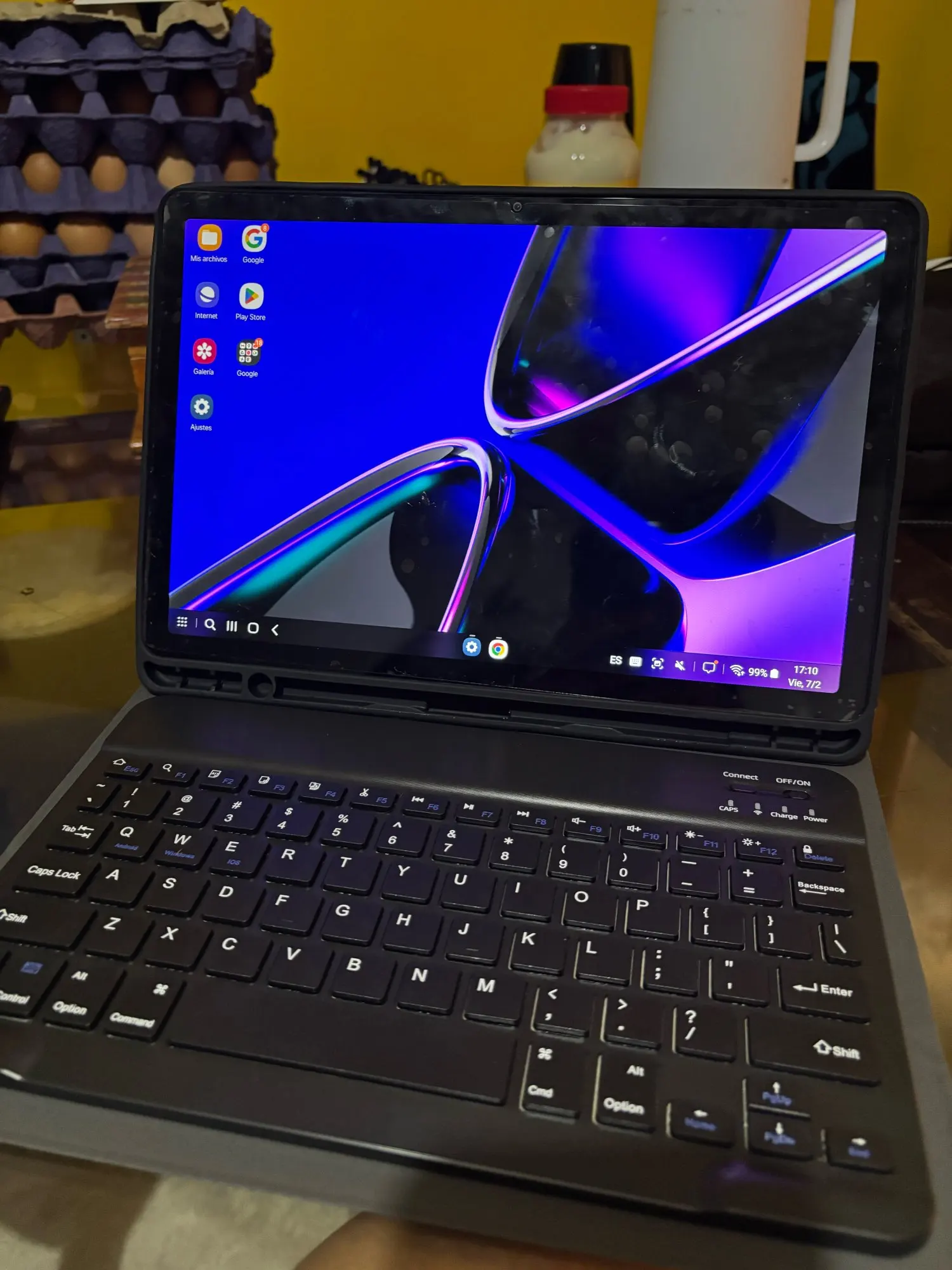 Very functional keyboard. Works via Bluetooth, can be easily recharged. Keep the charge.