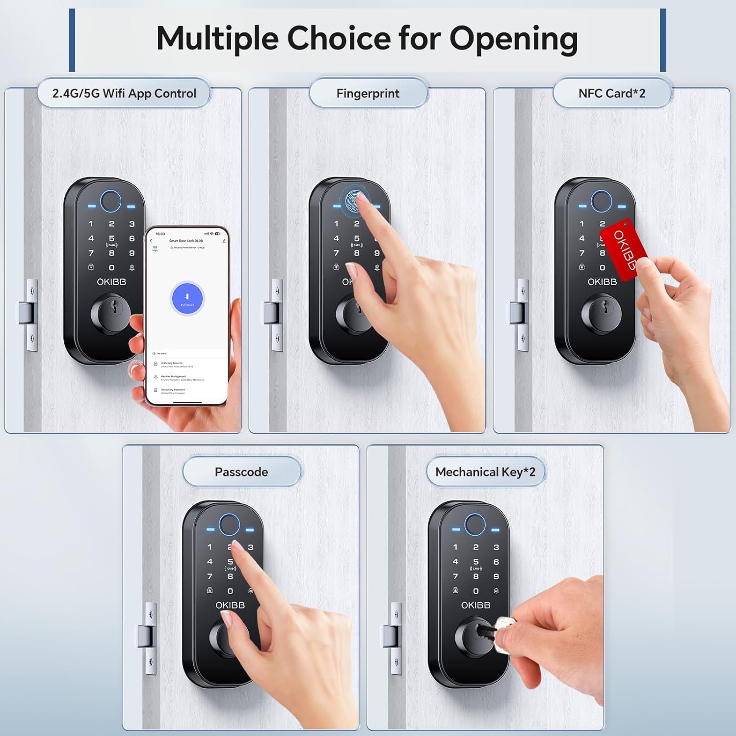 5-in-1 Smart Lock + Doorbell: Featuring remote built-in Wi-Fi control + fingerprint + passcode + fobs + mechanical key + built-in doorbell, the OKIBB smart lock delivers intelligent all-around security and unmatched convenience. It supports up to 200 unique code registrations, making it ideal for households with multiple users. With a lightning-fast 0.2-second recognition time, 0.9-second unlocking speed, and a 99.99% accuracy rate, this smart lock ensures quick and reliable access every time. Whether you prefer unlocking via fingerprint, passcode, or remote Wi-Fi control, the OKIBB smart lock offers an effortlessly convenient experience for your front door security.