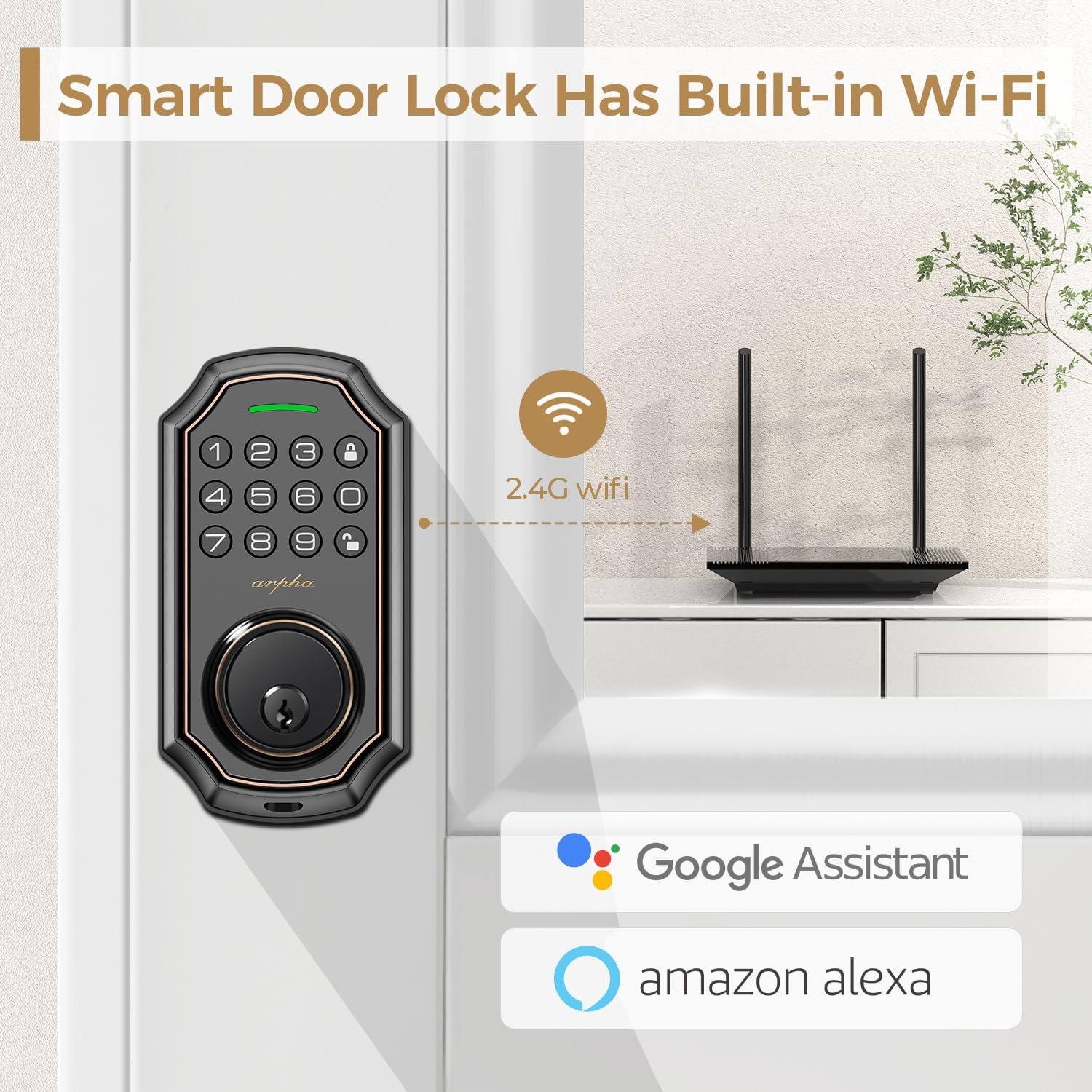 Keyless Entry Door Lock, WiFi Smart Keypad Front Door Deadbolt, Supports Amazon Alexa Voice Control, Google Assistant, Online App Control, Anti-Peeping Password, One-Time Code, Auto Lock