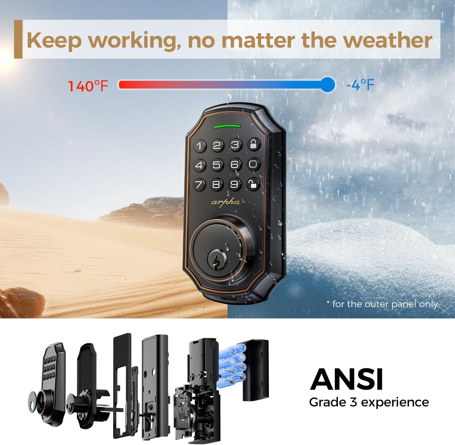 【ANSI Grade 3 Certified Heavy-Duty Deadbolt】Constructed with military-grade alloy and IP54-rated weather resistance, this all-metal smart lock operates flawlessly from -4°F to 140°F—guaranteeing deadbolt reliability through blizzards, monsoons, or desert heatwaves. Your front door security remains uninterrupted, 365 days a year.