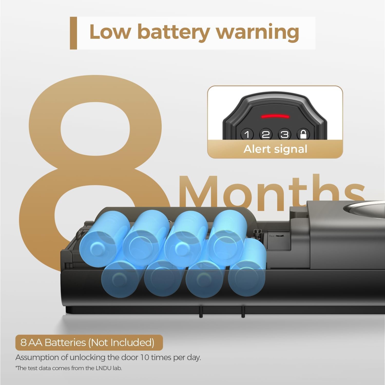 【Extended Power for Uninterrupted Operation】Equipped with 8 AA batteries delivering 9+ months of keyless entry functionality, the system proactively issues low-battery alerts through the app and keypad display. Never face emergency front door lock failures again.