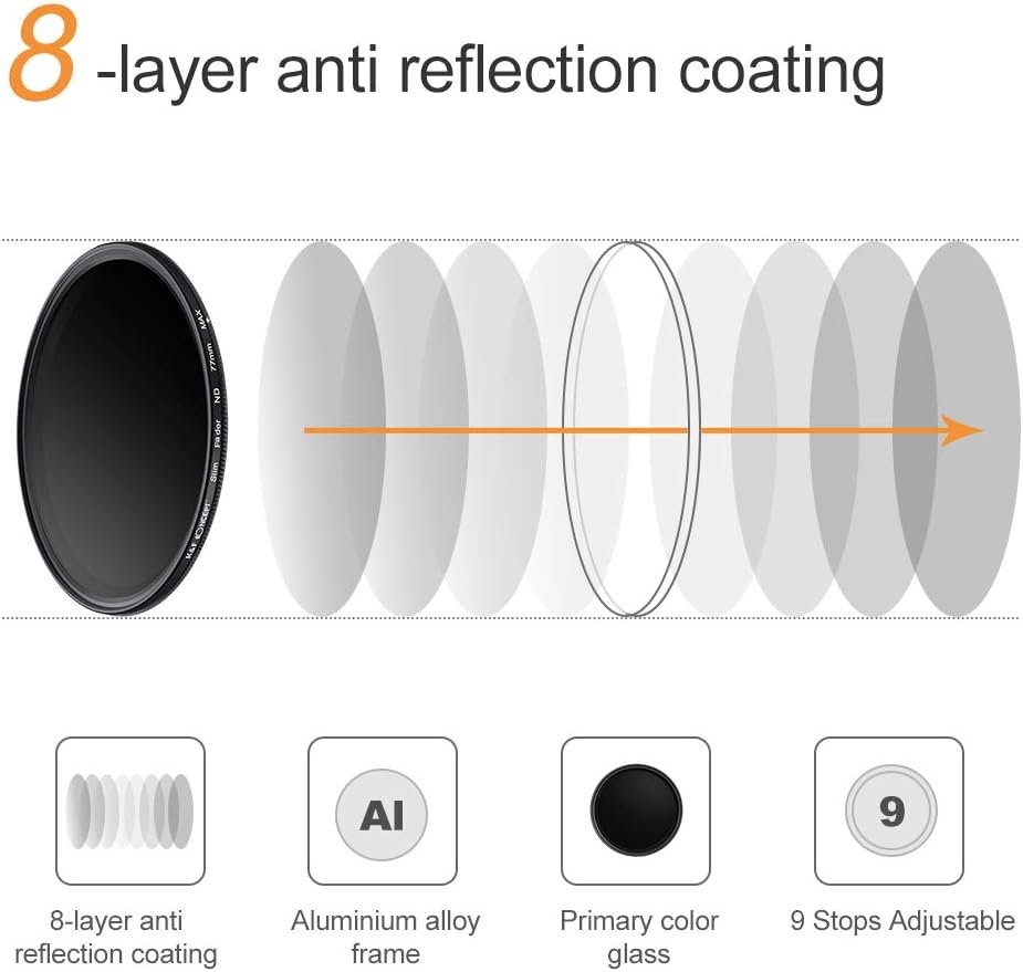 【Versatile Light Control】With 1 to 9 stops of adjustable light reduction and 360-degree rotation for precise dimming settings, this filter is perfect for diverse scenarios. (Note: Max stops may cause a cross-pattern effect, commonly known as an “X black cross.” This phenomenon is natural and temporary, occurring due to the adjustable ND filter’s interaction with specific lenses and focal lengths.