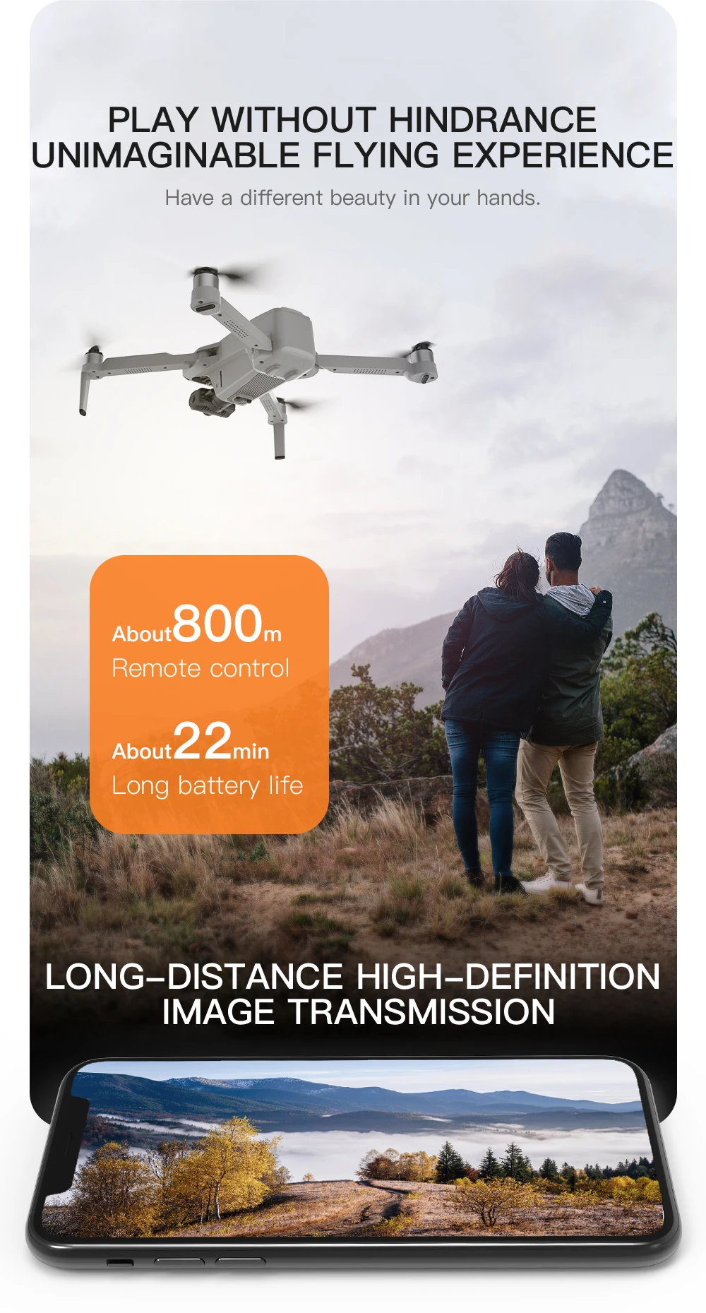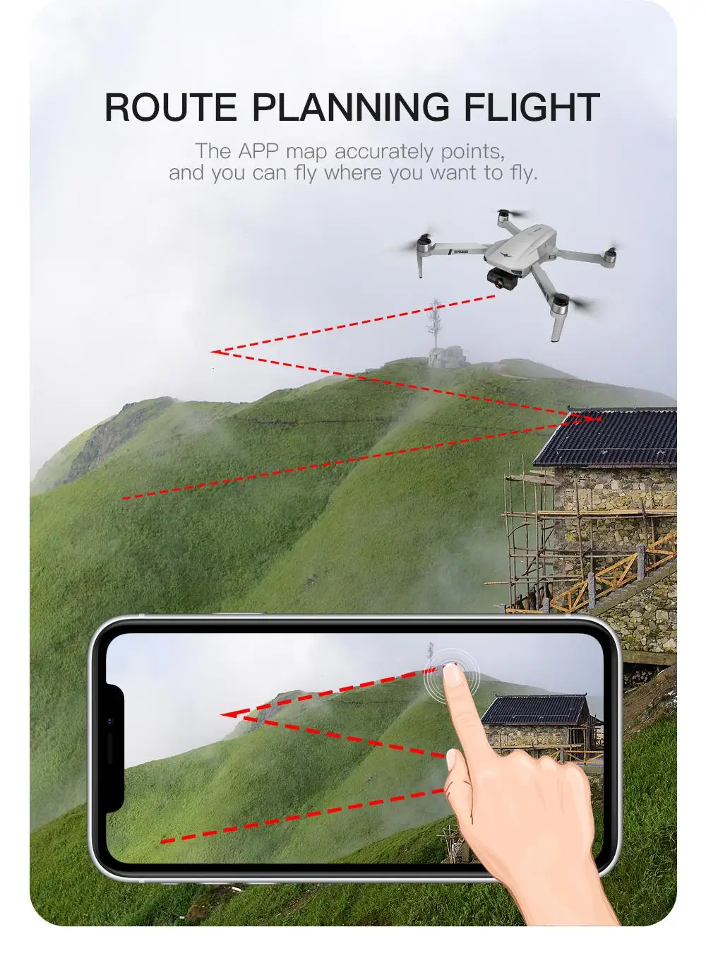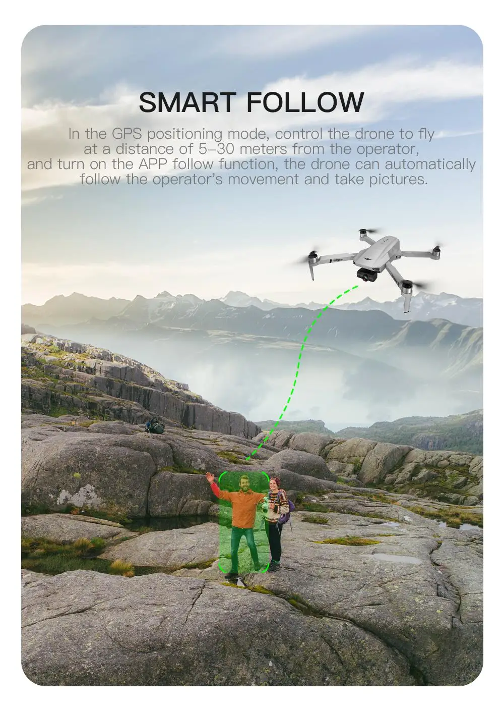 3.GPS Smart following:After the plane left the GPS, it will open the APP following function, and the plane will follow the mobile phone. In addition, Image Following: Detect the shooting object and follow the flight automatically.