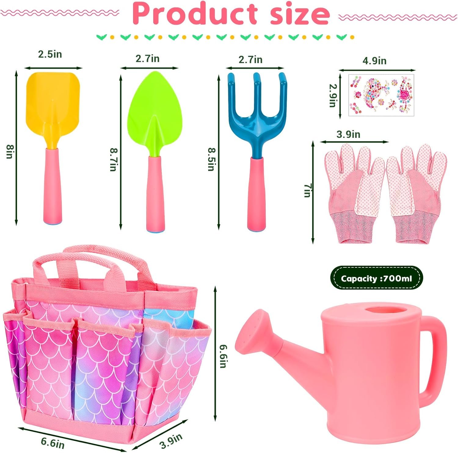 Perfect gardening tools set:The style of kid gardening tools set includes:1x watering can,1x trowel,1x rake,1x shovel,1 pair of gloves,1xgardening apron,1 x DIY sticker,1 x garden storage bags,various tools will helps the girls to learn gardening knowledge and improve hands-on skills,cute pattern can making the girls stand-out!