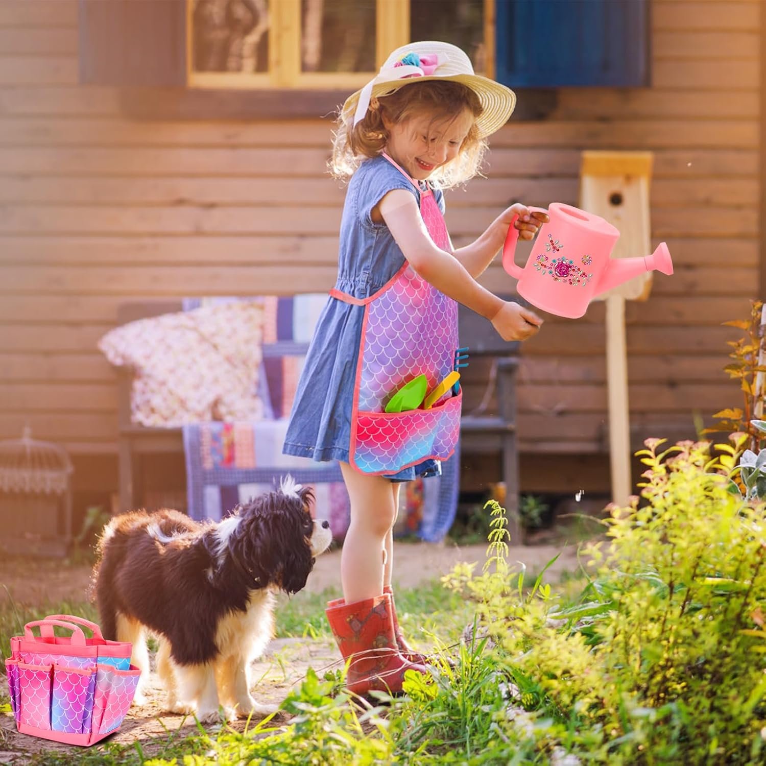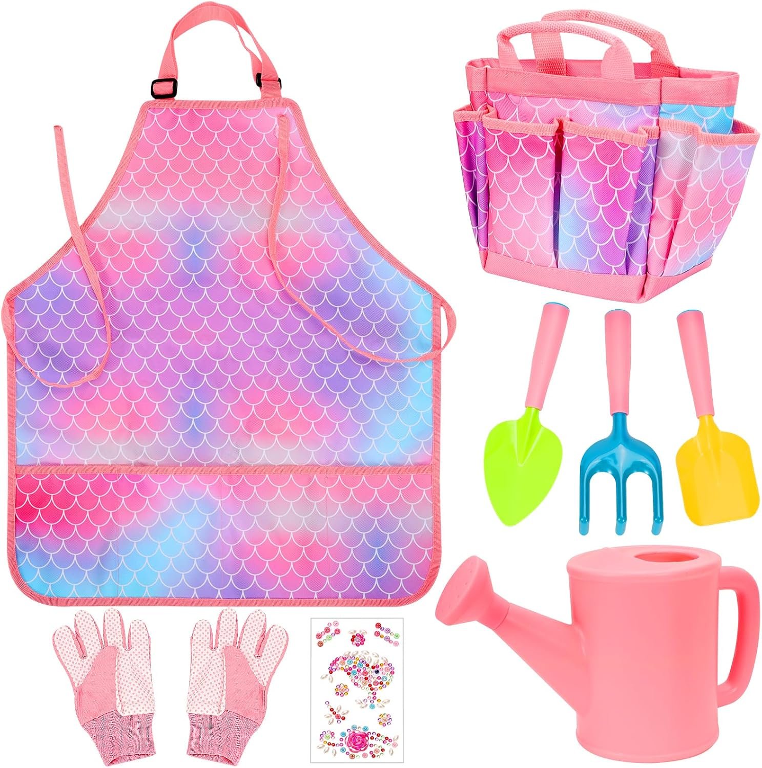 Kid Gardening Tools Set,Girls Gardening Tool Kit with Watering Can,Gloves,Hand Rake,Shovel,Waterproof Apron with Pockets,DIY Sticker,Garden Storage Bags,Gardening Set Girls Garden Toys