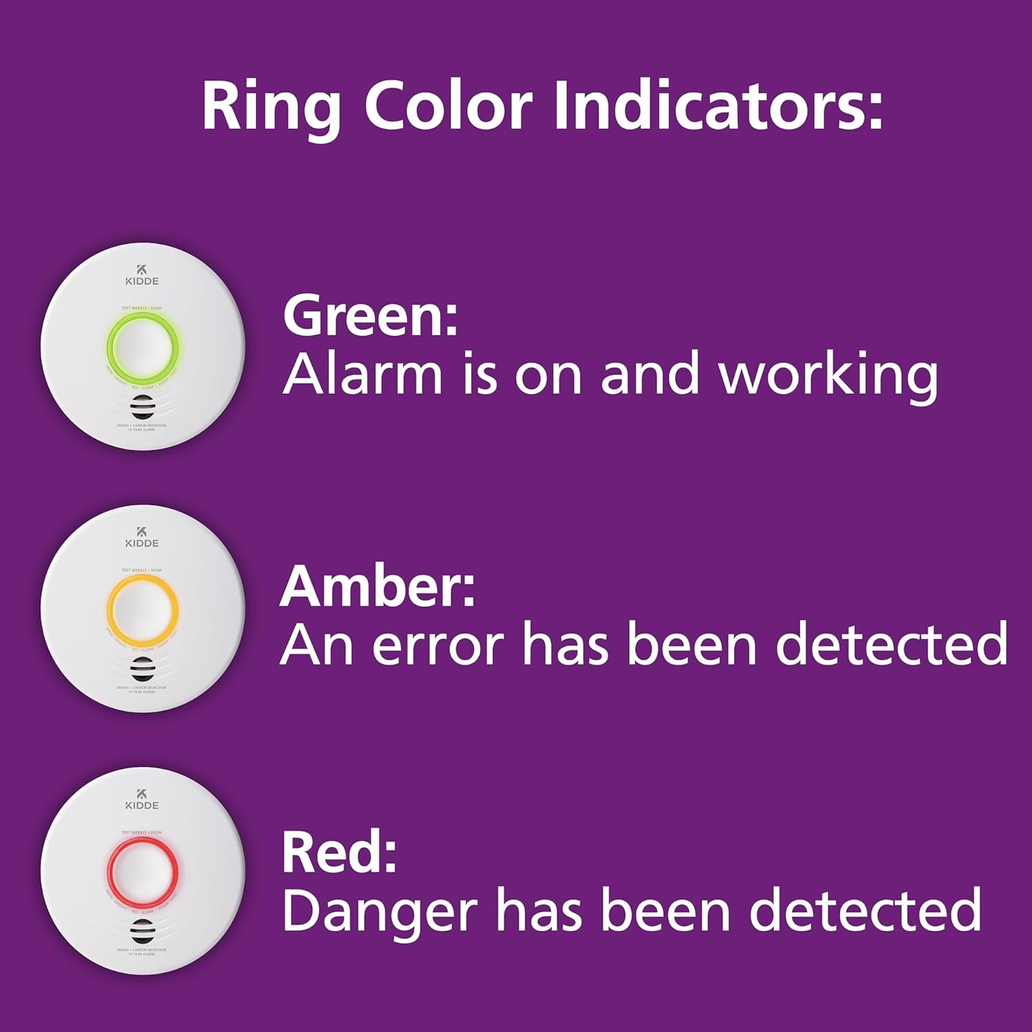 85-decibel alarm & LED warning indicators alert you to various status: green = normal operation, amber = operating error, and red = smoke, fire or carbon monoxide event