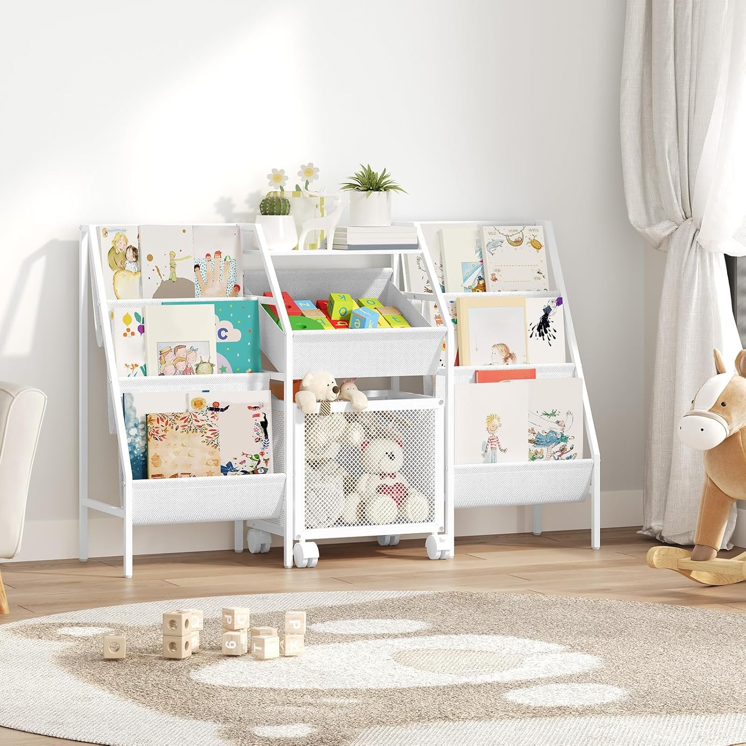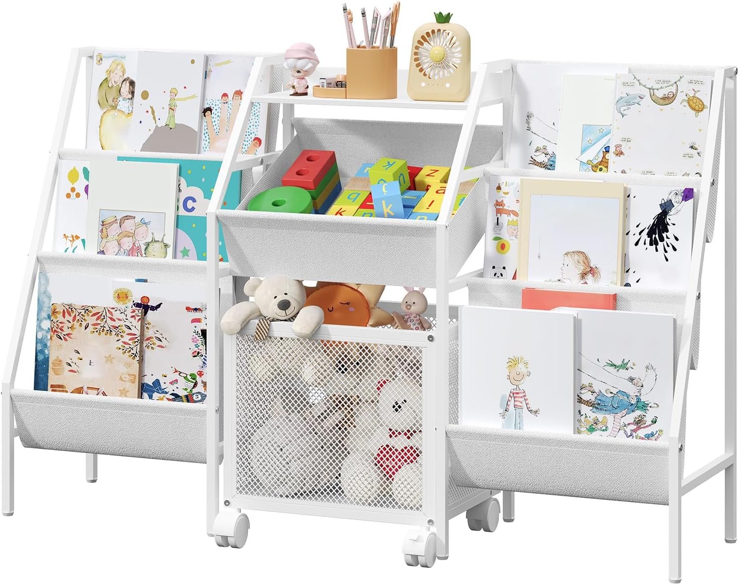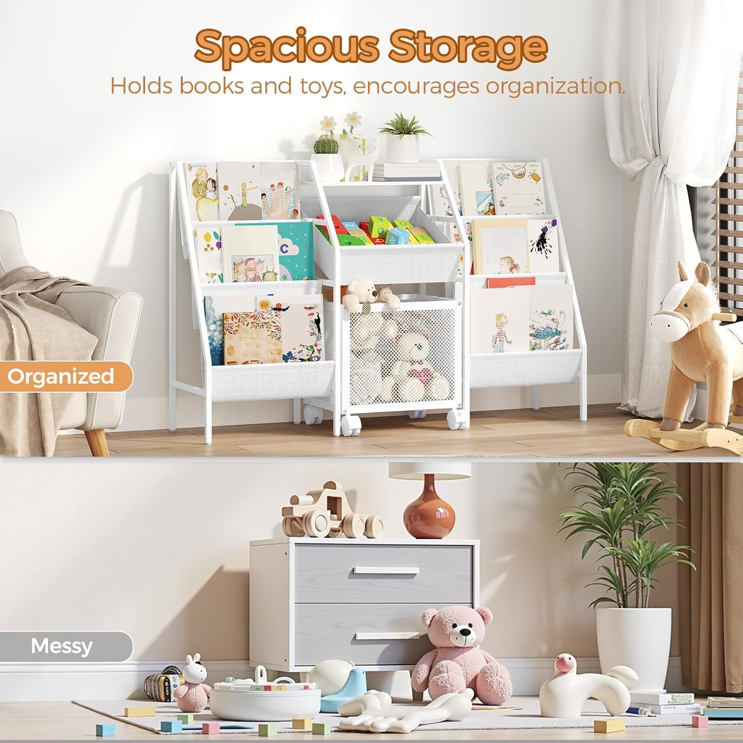 Spacious and Flexible Storage: This kids bookshelf is 11.8″ wide with dual 3-tier sling bookshelves. A central non-woven basket and a wheeled toy bin offer organized storage. The portable design encourages kids to tidy toys independently