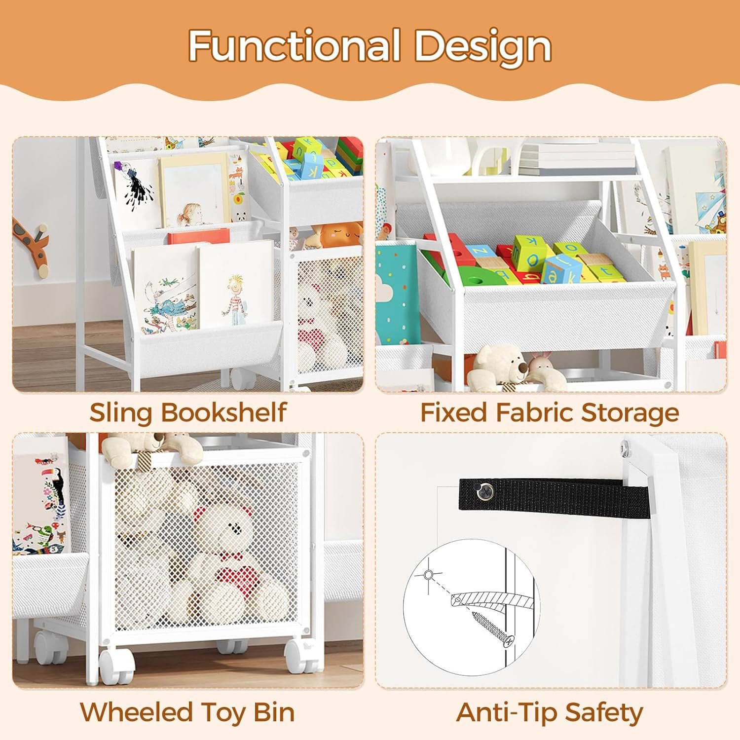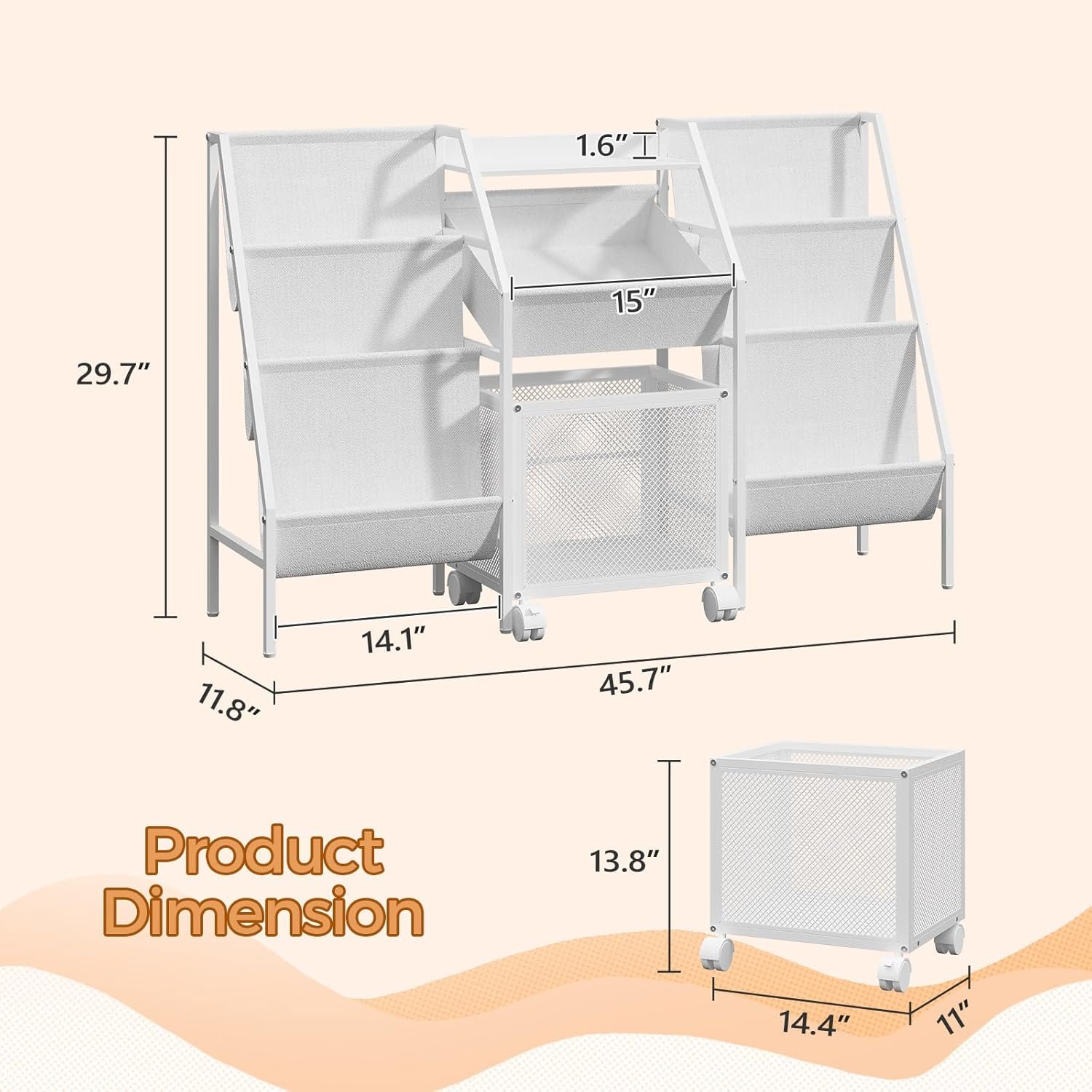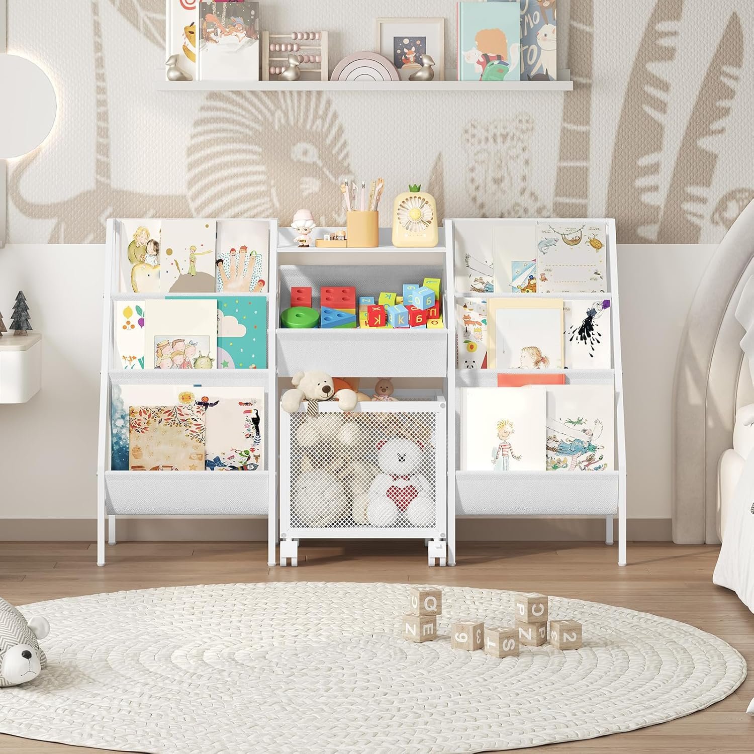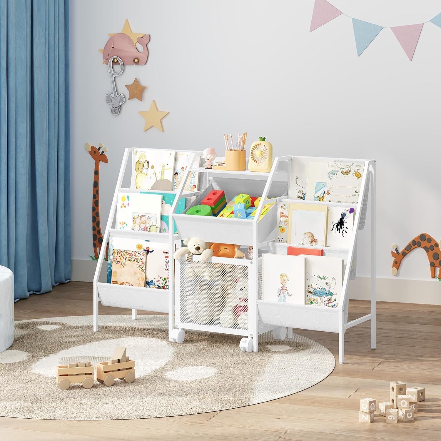 Spacious and Flexible Storage: This kids bookshelf is 11.8″ wide with dual 3-tier sling bookshelves. A central non-woven basket and a wheeled toy bin offer organized storage. The portable design encourages kids to tidy toys independently