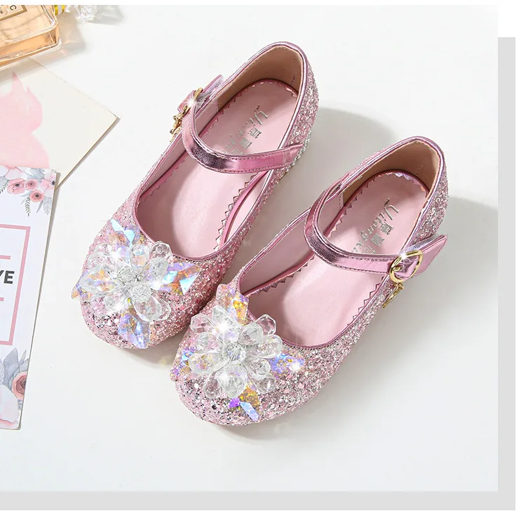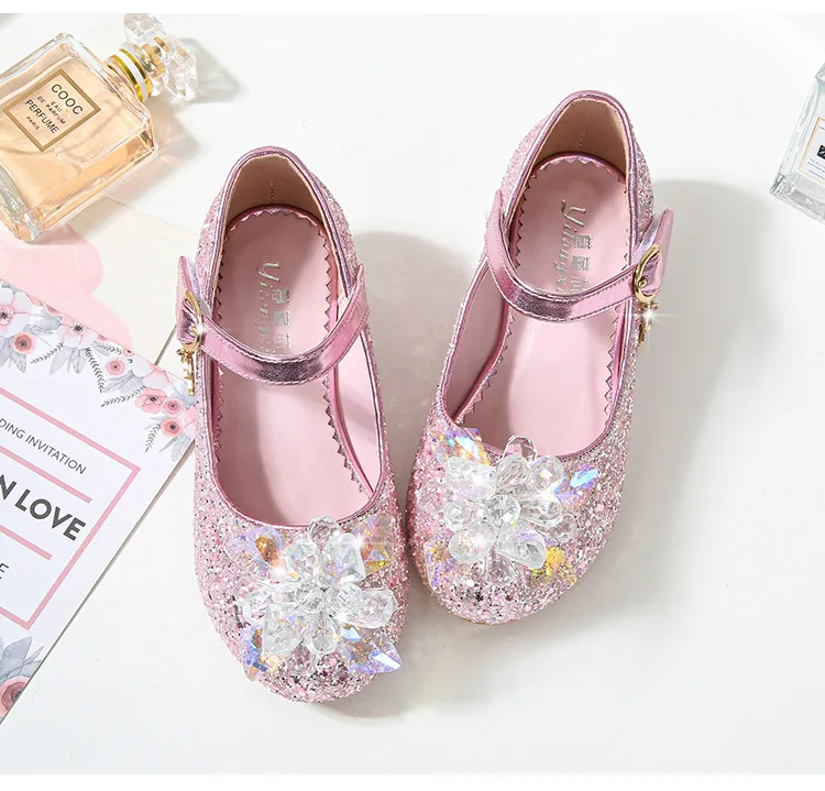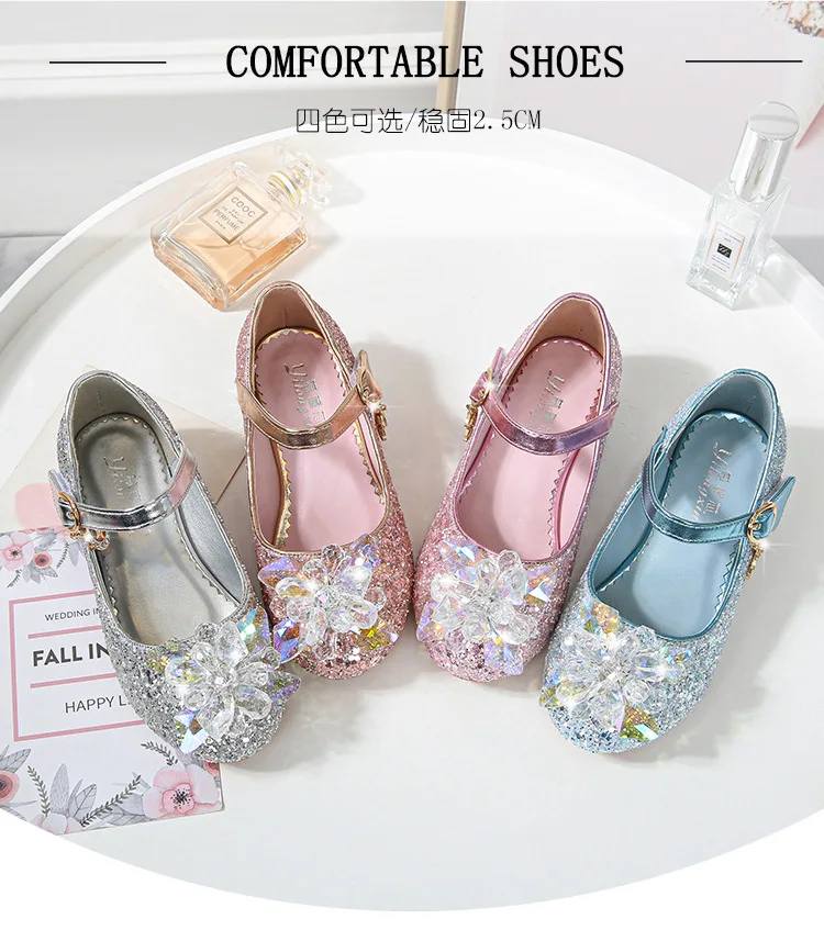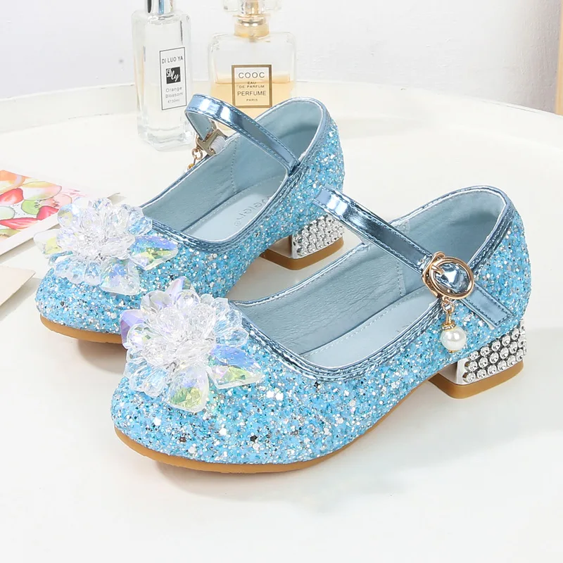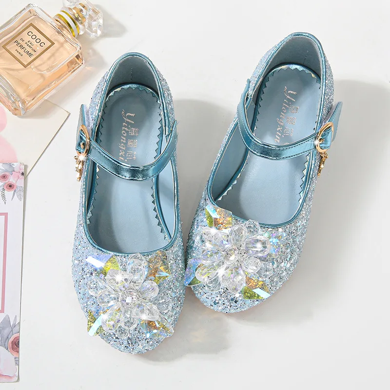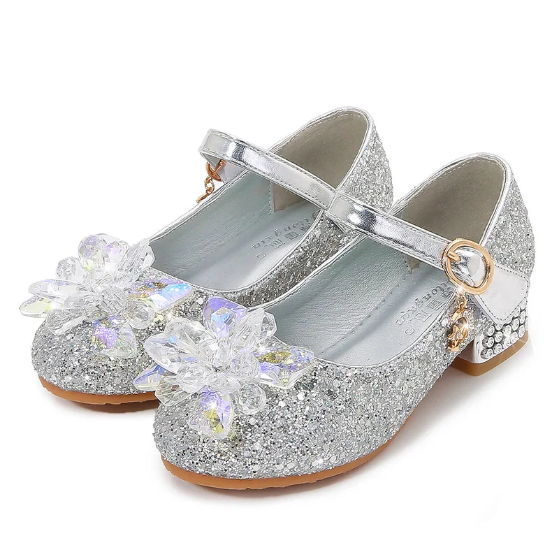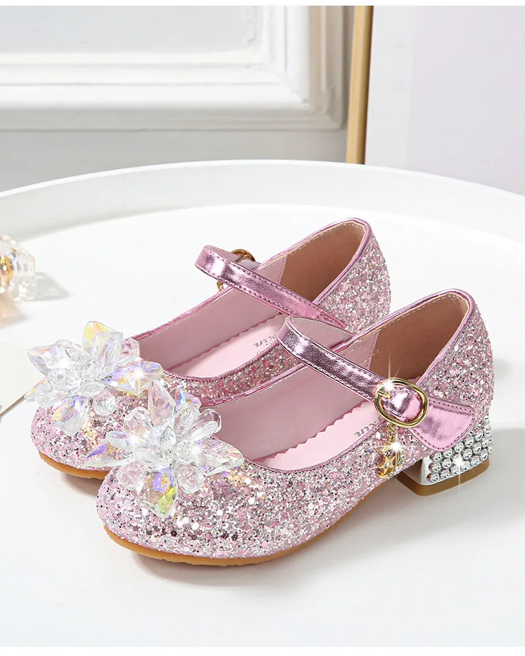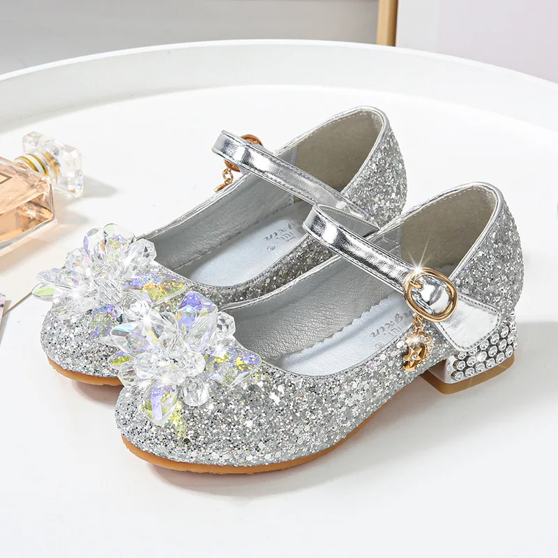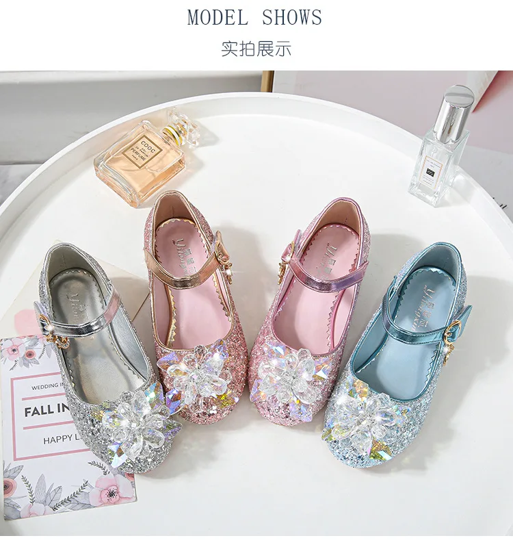 Kids Causal Shoes Wedding Party Children’s High Heels Princess Shiny Crystal Flower Girls Leather Shoes Pink Blue Sliver 23-38