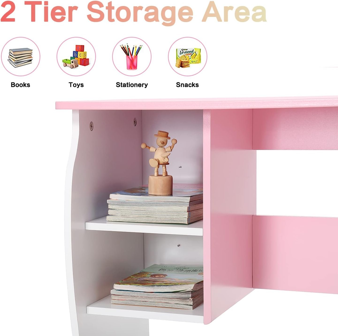 Kids Desk and Chair Set, Children Study Desk with Storage Shelf, Wooden School Study Table, Writing Table for Home School Use(Pink White)