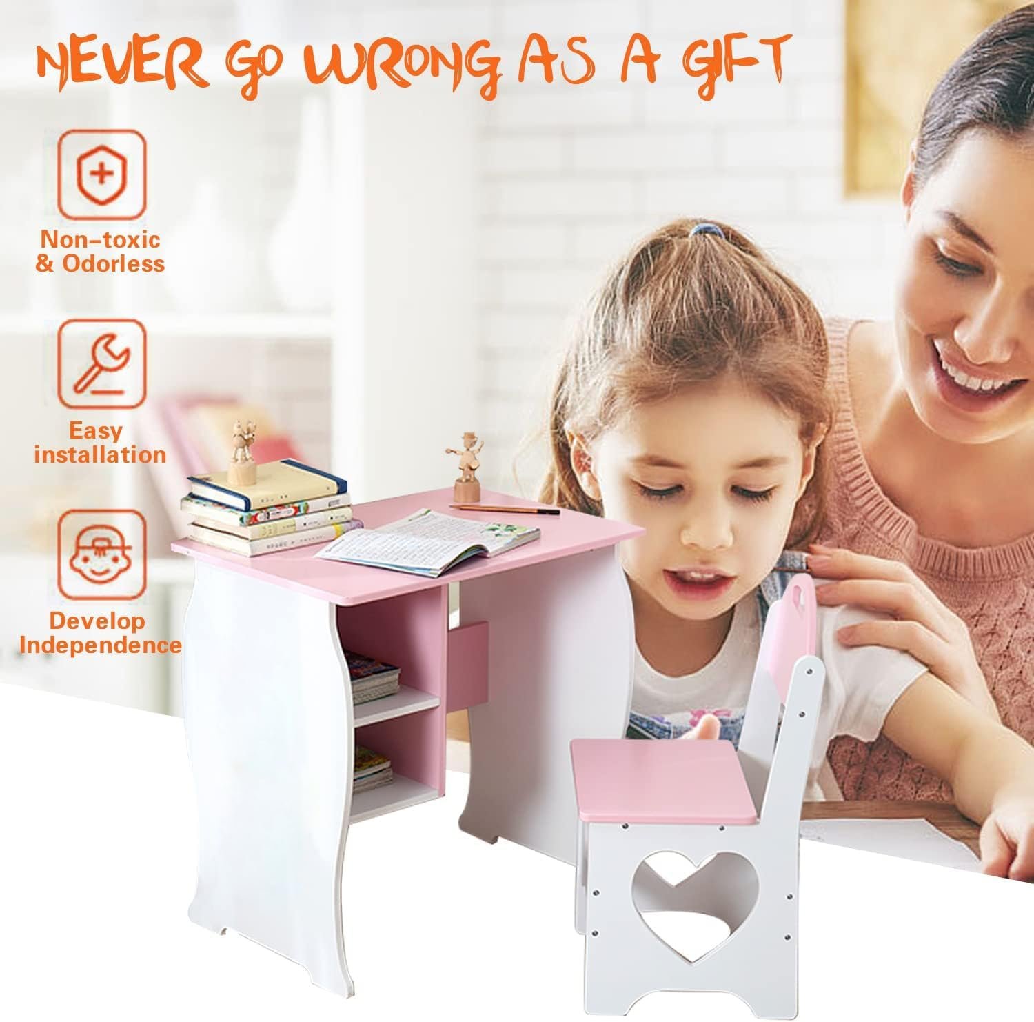【Simple & Stylish Appearance】With the white and pink finish gives the shelf a classic and simple touch, and can fit any home style. The side of the table has a cute kitten pattern while the chair is uniquely designed with a hollow love design on both sides. The stylish appearance is suitable for different decorative styles of bedroom or playroom. Perfect child height.