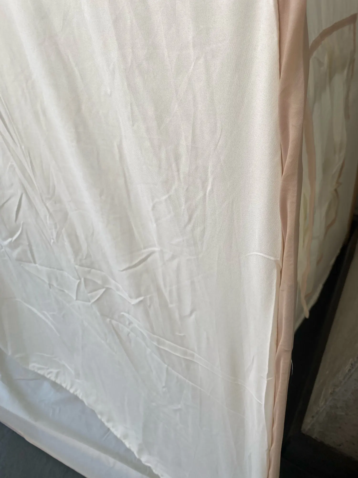 A very beautiful and stable tent. Cream color. The flag chains have nothing to hold them on. The size is large as in the picture