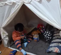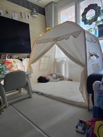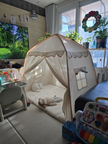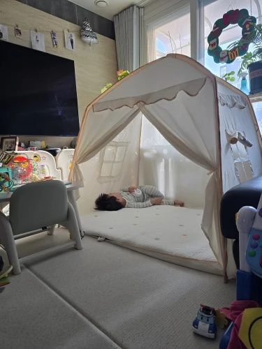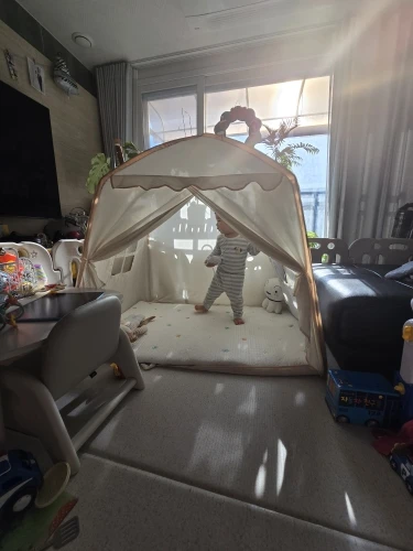 I haven’t put up the lights yet because the baby keeps pushing and making a fuss, but I think it will be pretty once I install the lights I ordered. It’s great value for money! The fabric came at the price of a vinyl tent sold at Coupang… I received it and thought it was a good purchase because the quality was good haha. There was no smell, but since it’s for the baby, I washed it with wool detergent, dried it, and assembled it. The baby loves it so much that it doesn’t come off haha. It’s also really spacious, perfect for rolling around haha. Oh wow! It’s quite large, so please refer to the size before purchasing~~ Great value for money item 👍