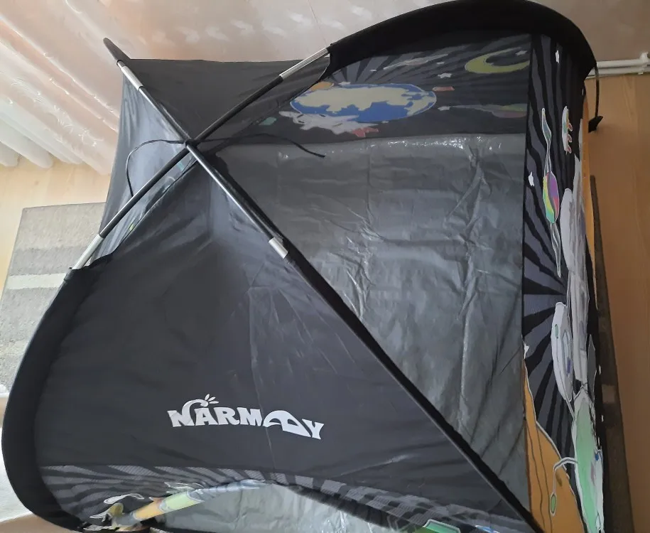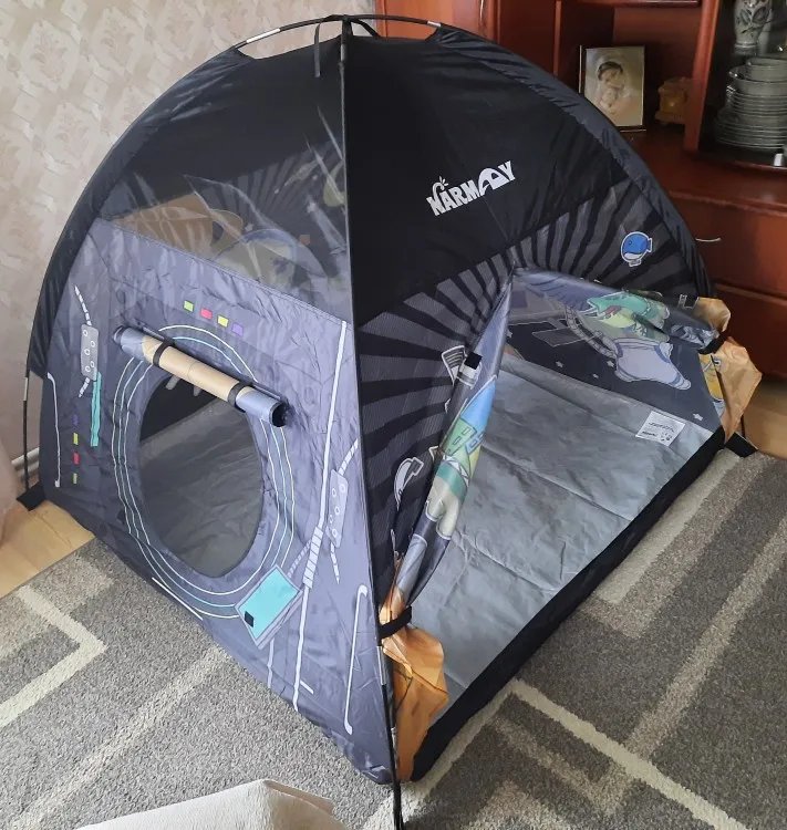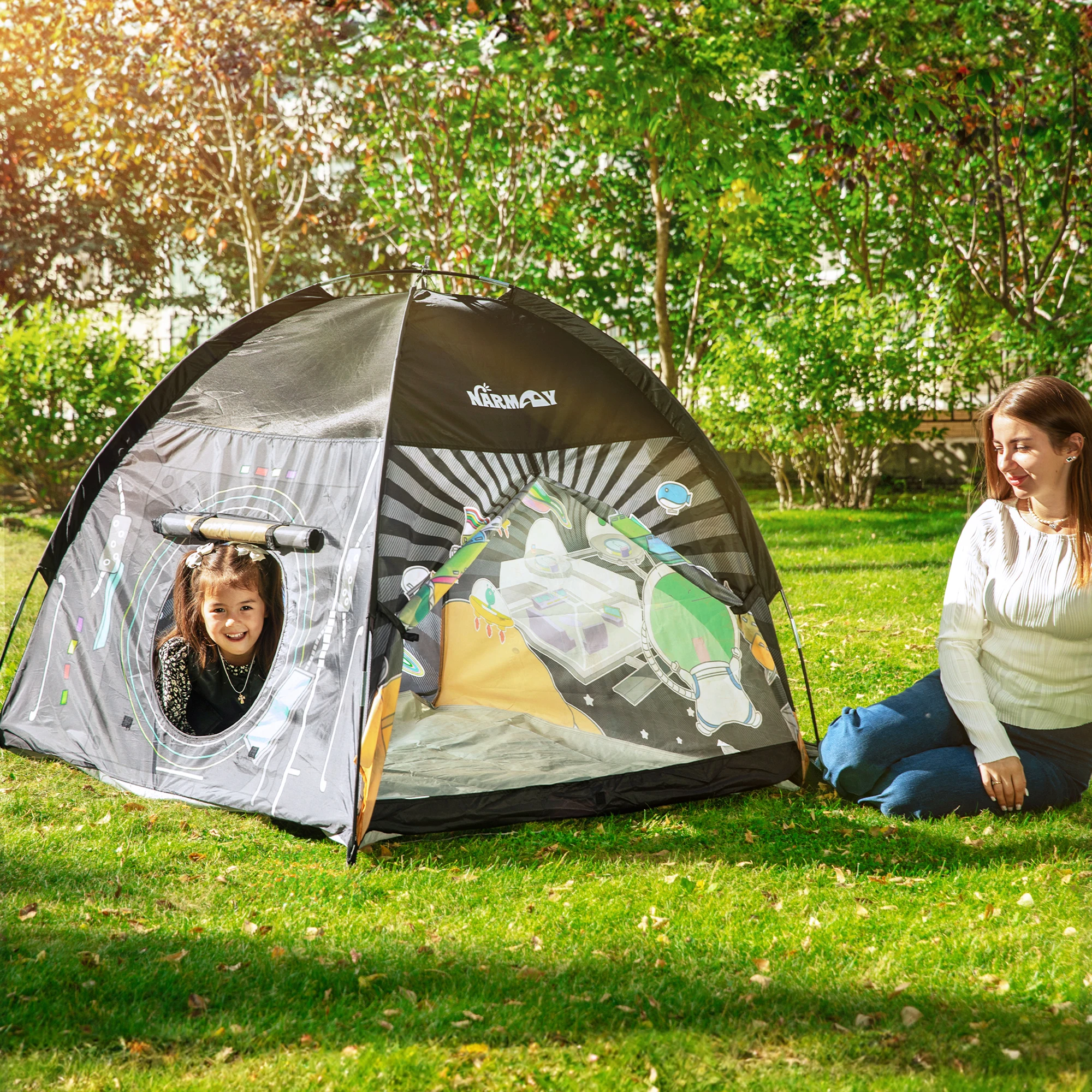 The SPACE WORLD Sturdy tent from NARMAY is ideal for indoor fun or outdoor play. We designed three outer space scenes in the tent, and the tunnel port was intended to be a space capsule door. All the details come from the heart and soul of NARMAY to inspire children’s imagination of being an astronaut to explore the universe. The waterproof floor of the tent keeps spills from ruining the carpet and keeps children dry away from the wet grass. We add a mesh at the top of the tent for extra ventilation, and it gives parents a full view of the inside. The high-quality Polyester taffeta prevents rips and tears. Two durable PE-coated fibreglass shock-corded tent poles prevent splinters or shattering in case of breakage.