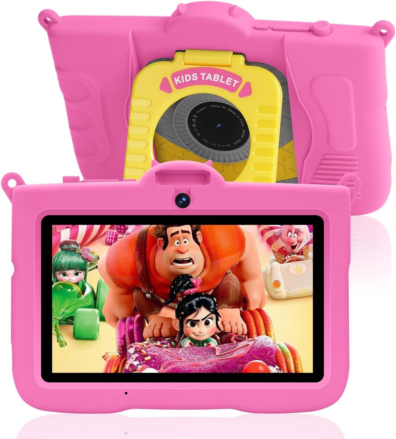 Kids Tablet 7 inch Android 13 for Toddler, 8GB RAM 64GB ROM,Parental Control, IPS Screen, with Drop-Proof Case, Dual Camera, Pre-Installed Kids Software, Bluetoooth, WiFi Tablet(Pink)