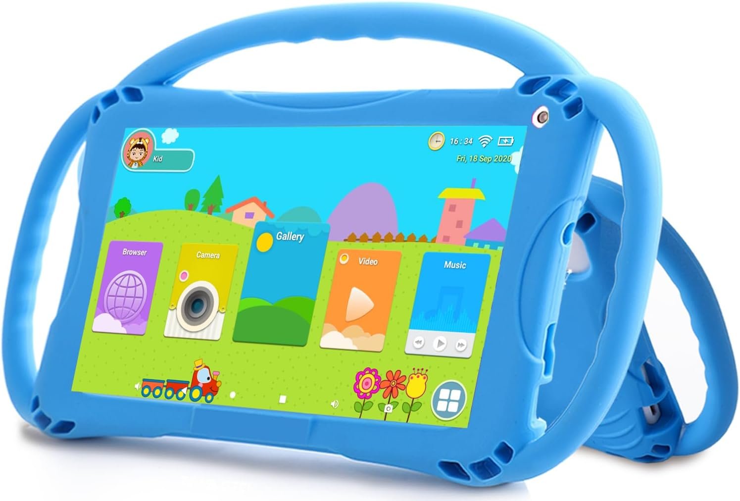 A Full feature 7 inch Toddler tablet for kids built in upgraded 1.6Ghz Quad-Core 2GB+32GB Flash Android operating 10.0 system, Kids tablet with case included, toddler ipad build in portable on-the-go fun three handles baby tablet, tablets for toddlers support Spanish (tabletas para niños)