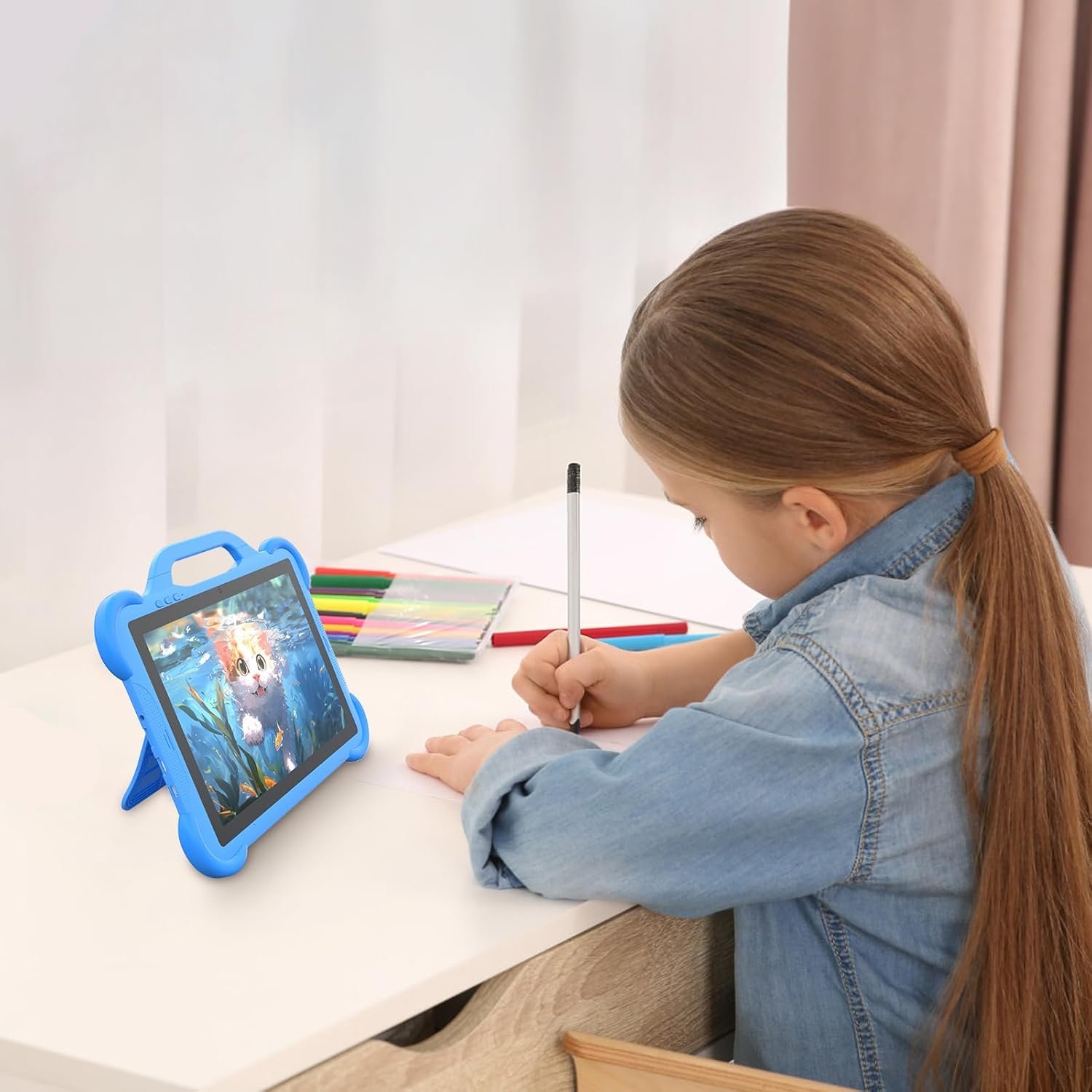 This Picheng 10.1-inch kids tablet features a protective case with a handy carry handle and a cute illustrated back cover. Running on Android 14.0, it offers 8GB RAM, 64GB storage, an IPS display (1280×800), dual cameras (2.0MP/5.0MP)—perfect for young users.