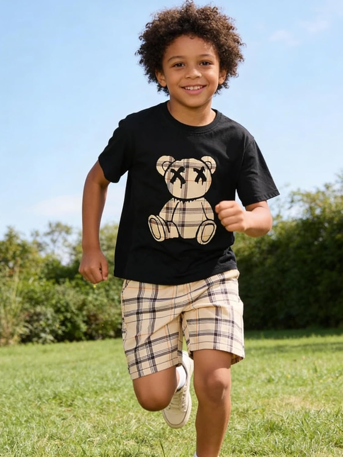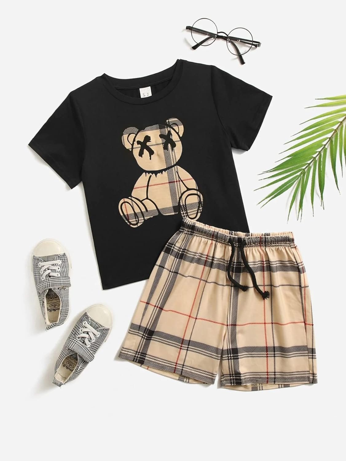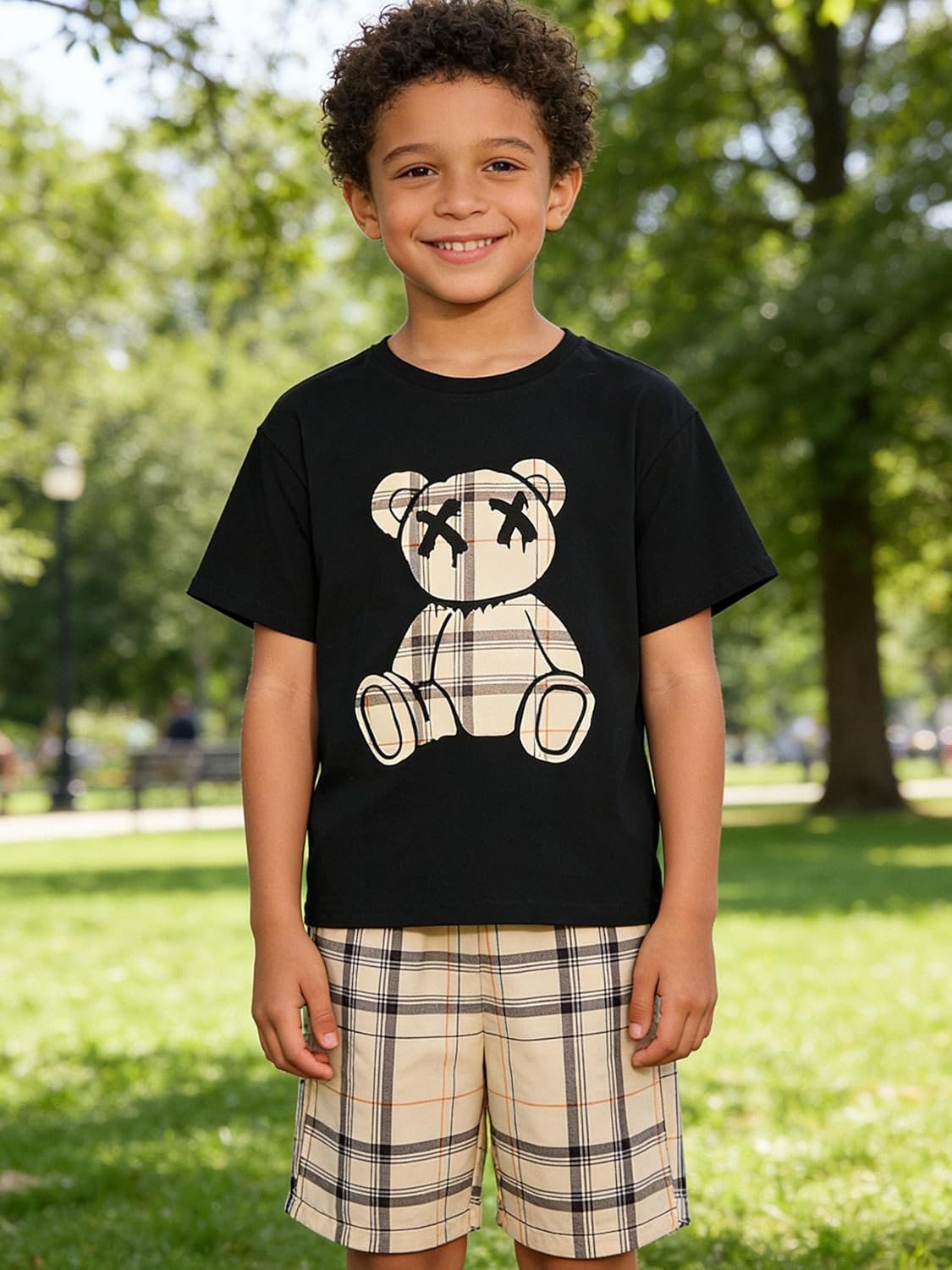 Boy Bear Print Tee + Plaid Shorts 2 Pieces Summer Shorts Set