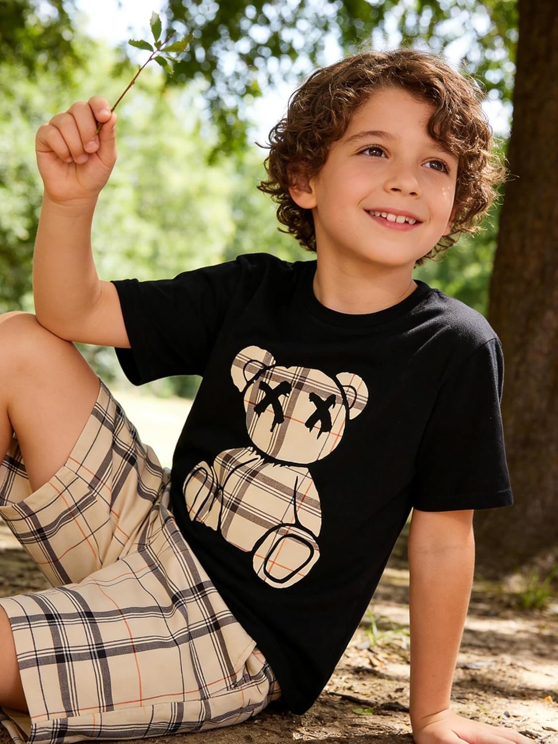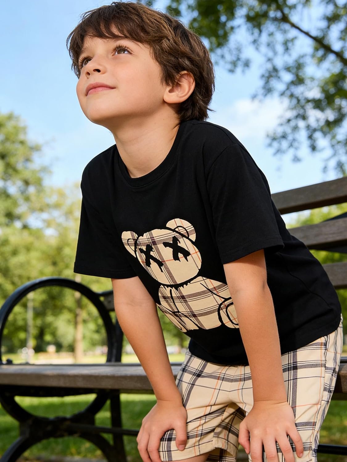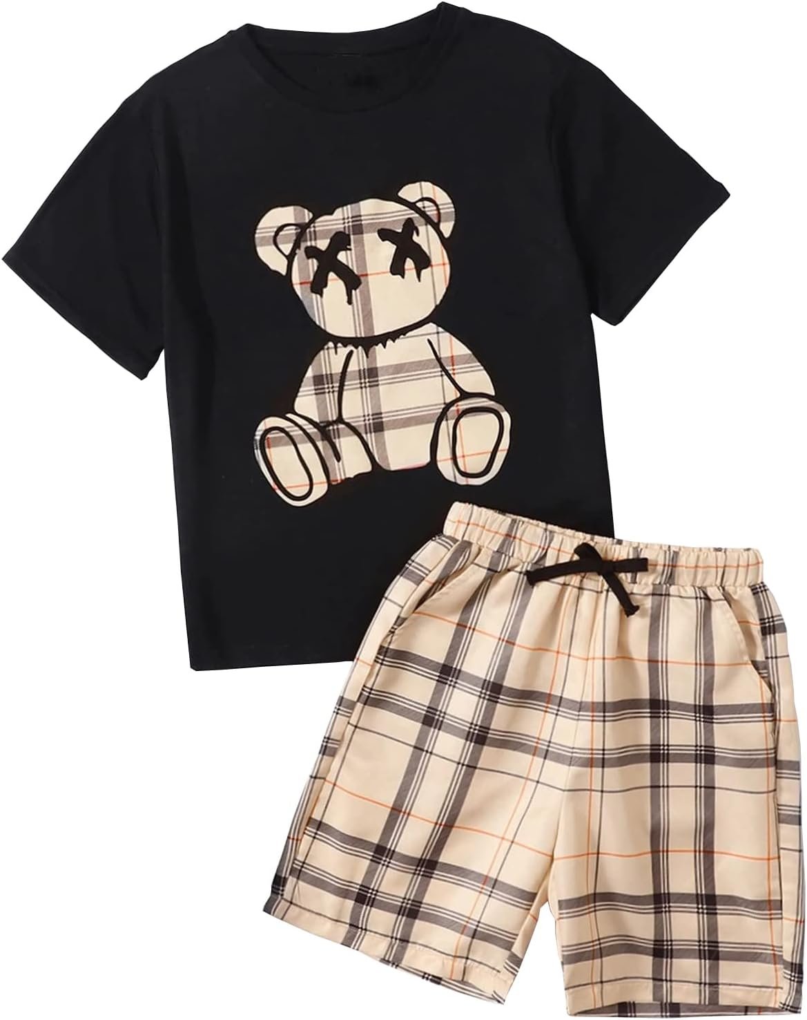 Boy Bear Print Tee + Plaid Shorts 2 Pieces Summer Shorts Set