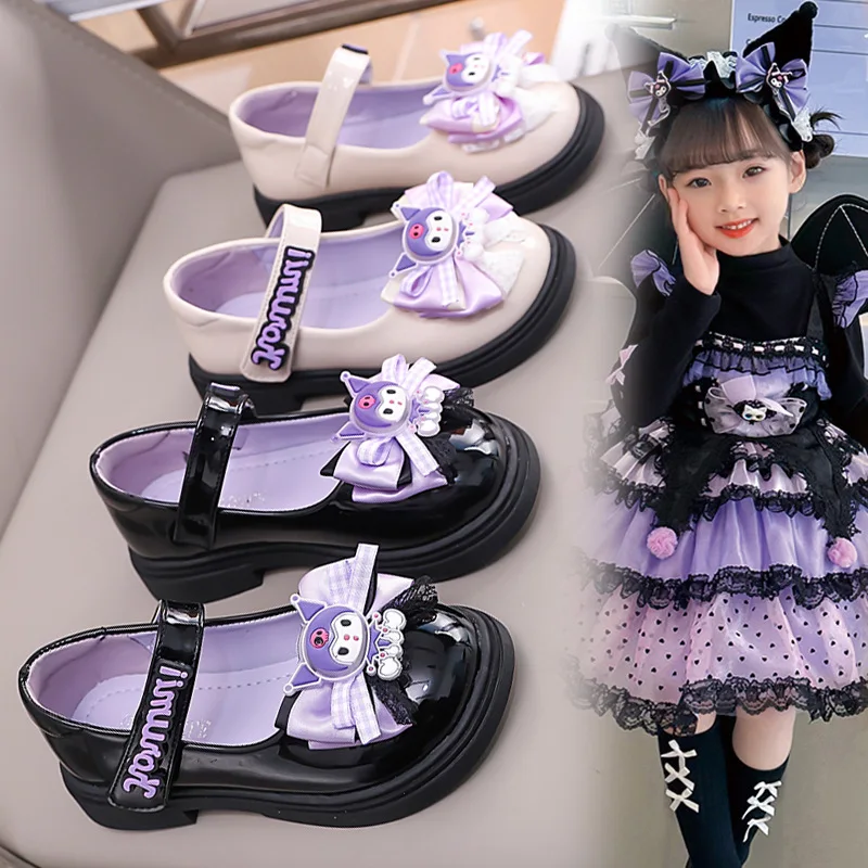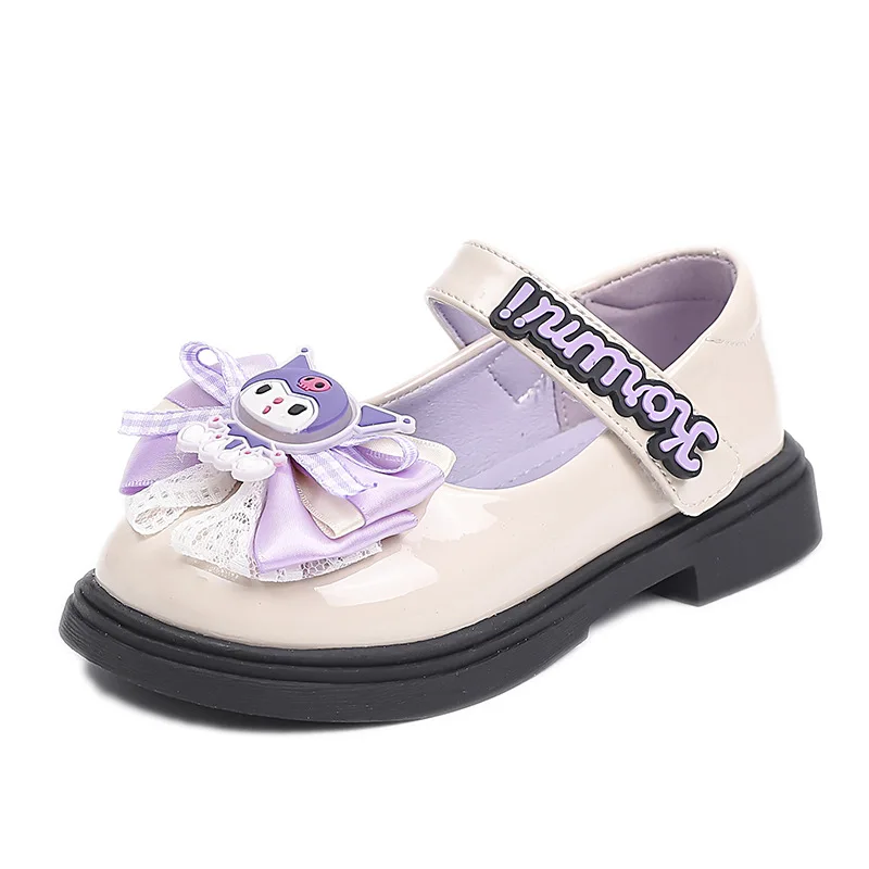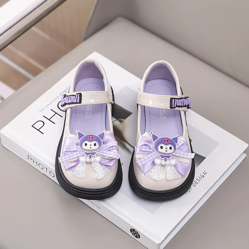 Kids’Sandals Kuromi PU Leather Bow Flat Spring Shoes For Girls Anti-slip Soft Thick Bottom White Black Shoes Size 26-36
