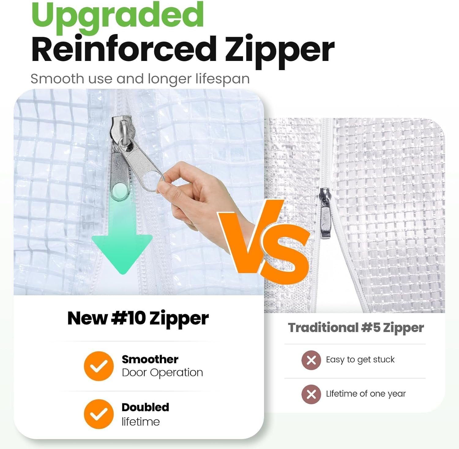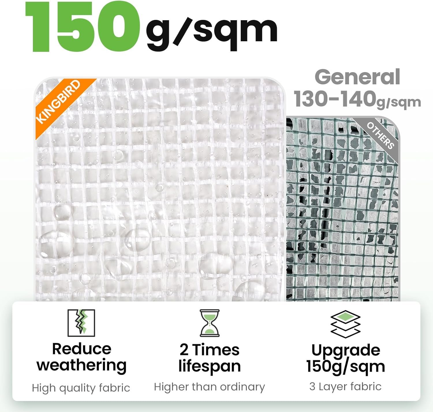 [UVI 6 Protected Cover]–Waterproof 150g/sqm PE grid cover is UV Index 6 protected, protects your plants from excess rays, which doubles the service life: Compared to other greenhouse(UVI 1-3) that only lasts for 1-6 months, the KING-cover lasts for over years. The reinforced odorless PE covering material provides safe work zone. The cover fits the frame closely, enhancing warmth and wind resistance.