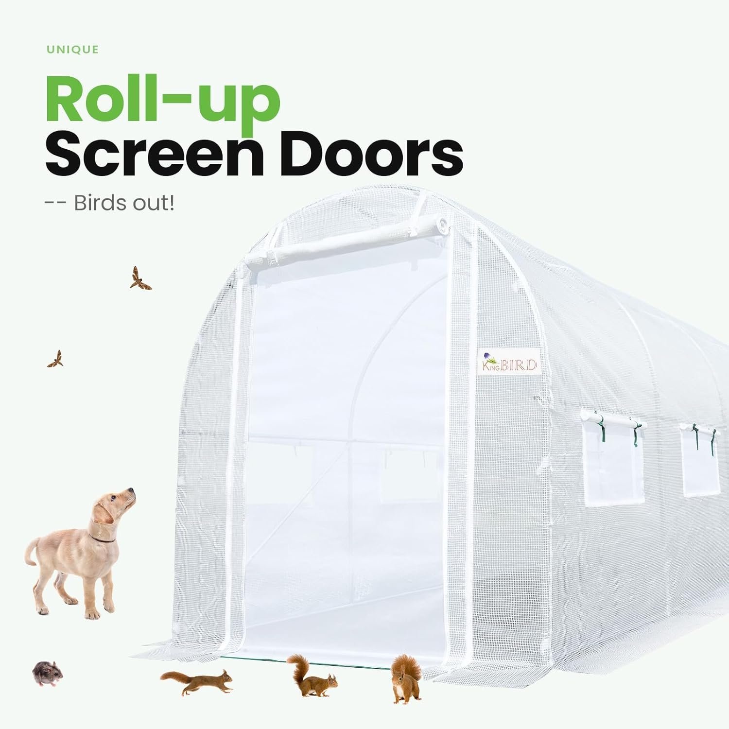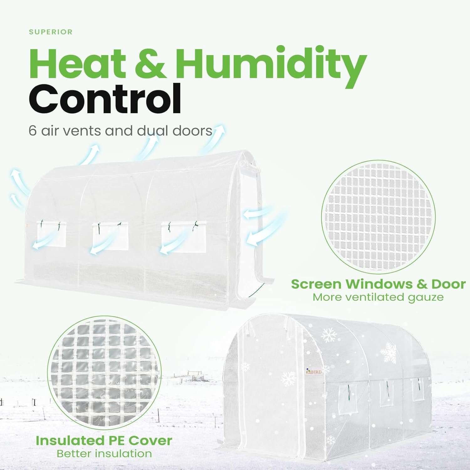 [Temperature & Humidity Management]–Featuring 6 roll-up screen windows plus 2 door-netting, it facilitates temperature and humidity control. It increases temperature promoting early spring plant growth, enhances ventilation on hot summer days, and retains warmth during the winter. It keeps plants from pouring rain, winds, and snow.