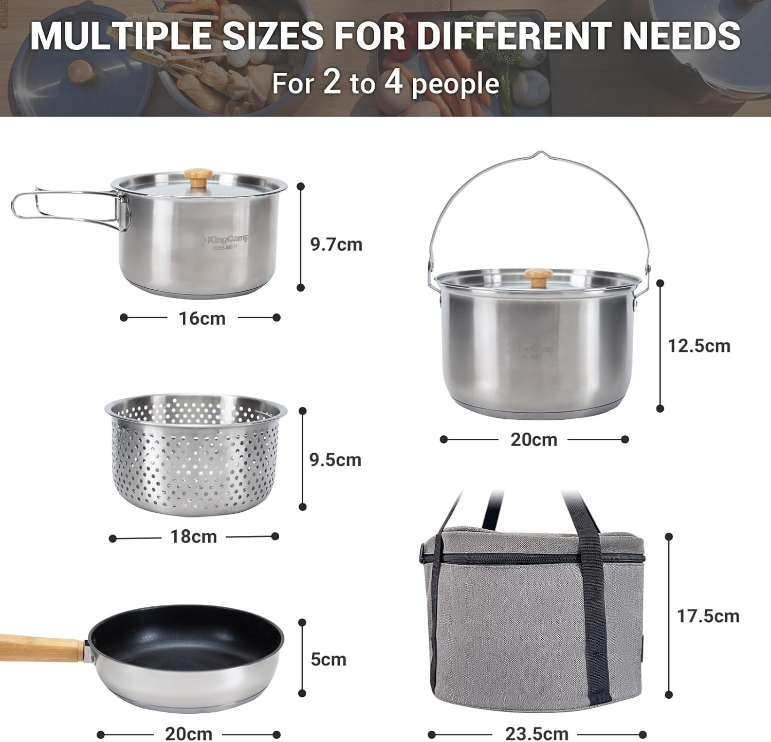 KingCamp Camping Cookware Set 304 Stainless Steel Campfire Cooking Pots Pan and Kettle with Travel Tote Bag for Camping Outdoor Kitchen Cooking Picnic for 4-6