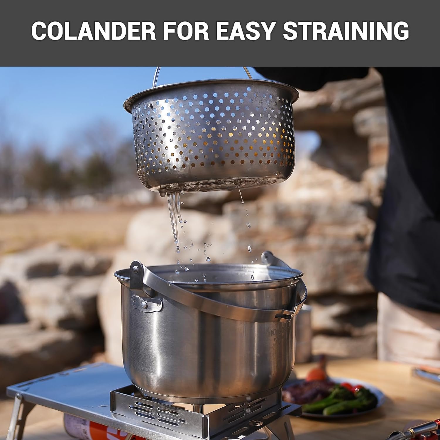 304 STAINLESS STEEL:The cookware is made of 304 double-bottomed stainless steel; The material is robustness and resistance against wear and tear or corrosion, and conducts heat speedly. Enjoy your outdoor meals, heated via open flame, charcoal, wood, gas or induction cooker with our cookware set