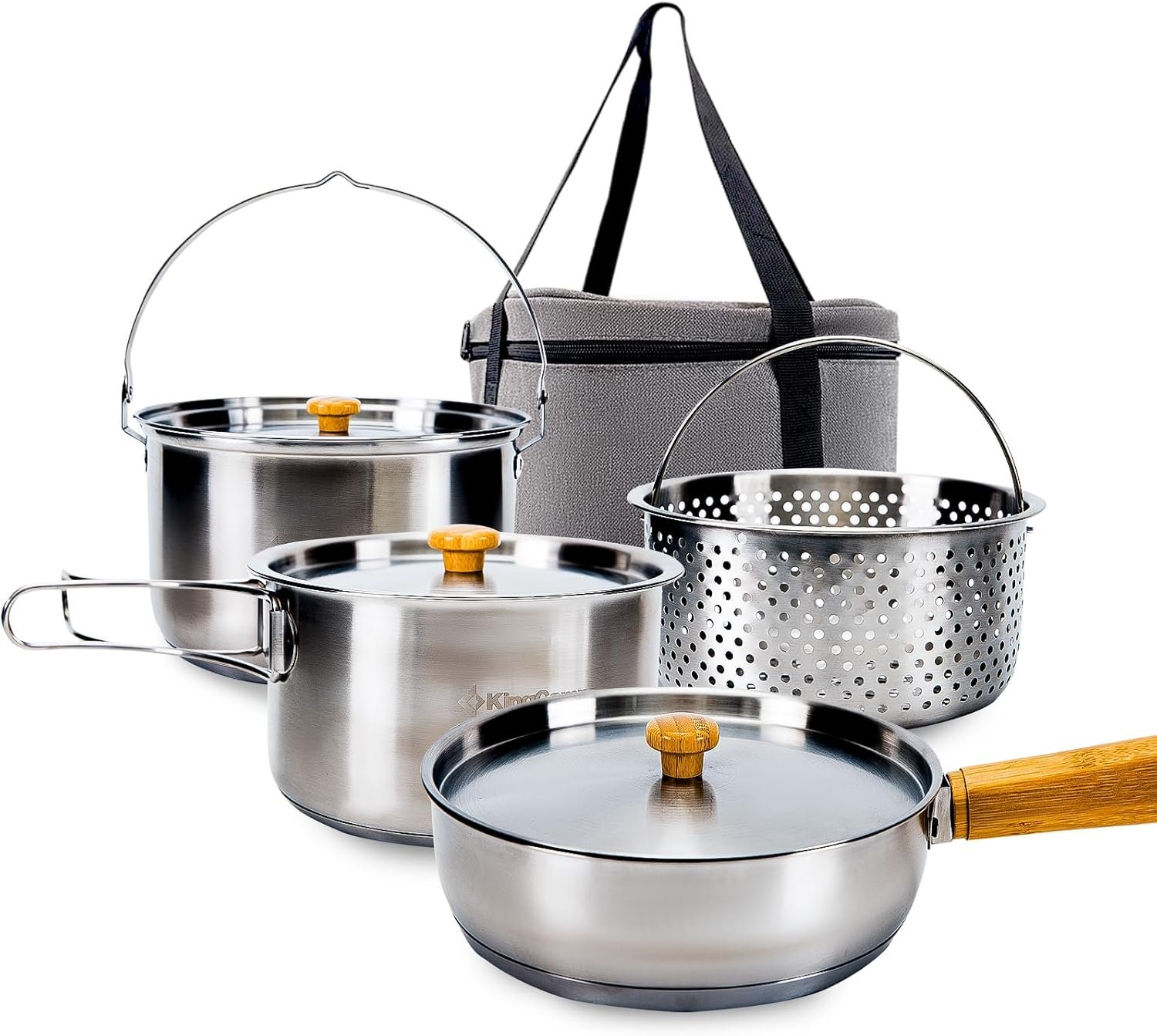 KingCamp Camping Cookware Set 304 Stainless Steel Campfire Cooking Pots Pan and Kettle with Travel Tote Bag for Camping Outdoor Kitchen Cooking Picnic for 4-6