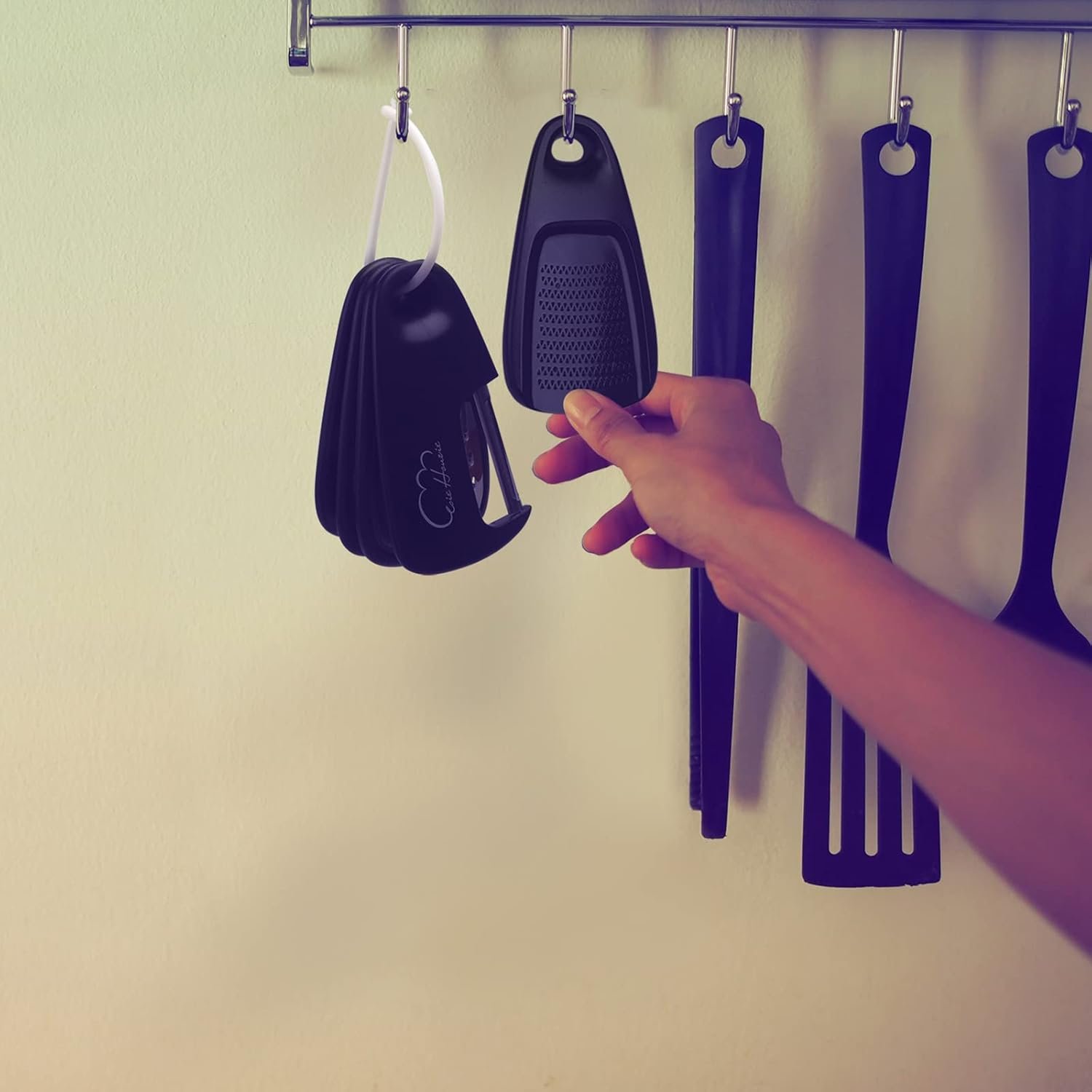 Kitchenware with holes on the handles can also be hung for storage, but with the help of the additional locking ring, hang a string of 5- 6 kitchen tools with just one hook, do saves a ton of valuable space.