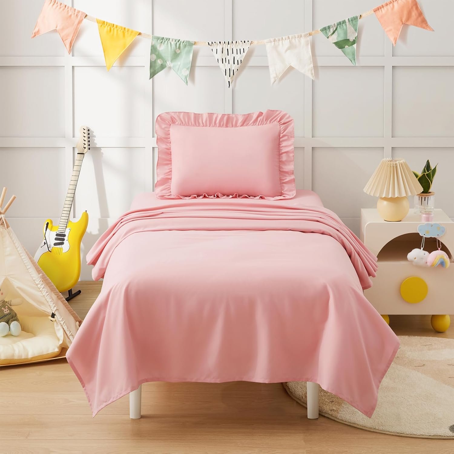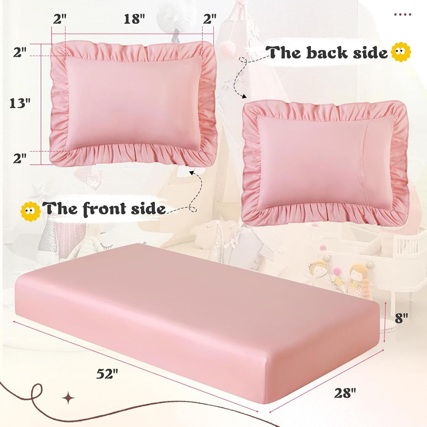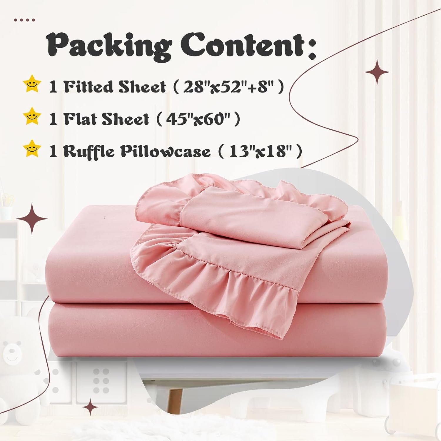 Packaging: A flat sheet (45×60 inches), A fitted sheet (28x52x8 inches), A ruffle pillow sham (13×18 inches).