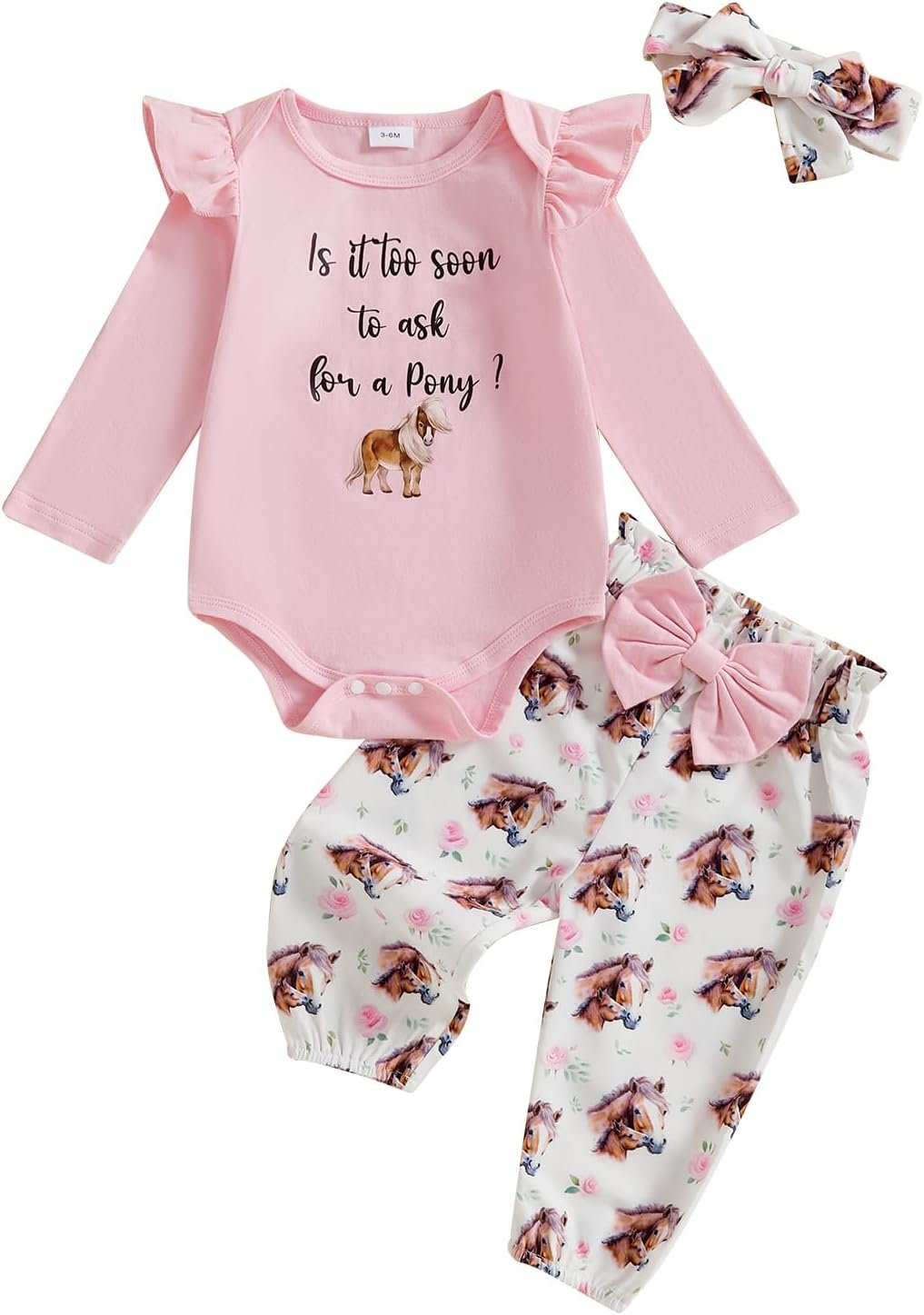 Baby Girls 3PCS Pants Sets Long Sleeve Letter Print Romper Horse/Boots Print Pants Headband Sets