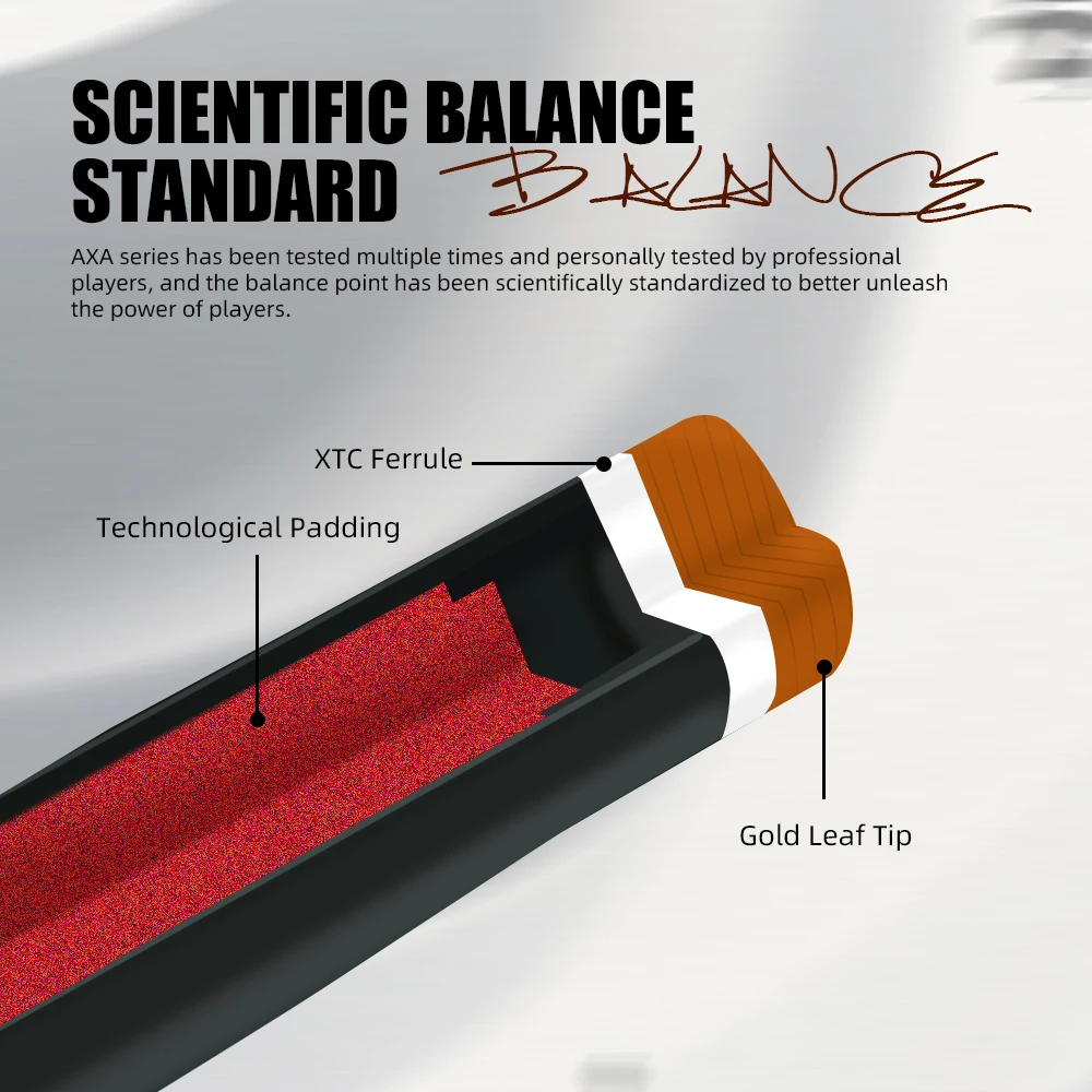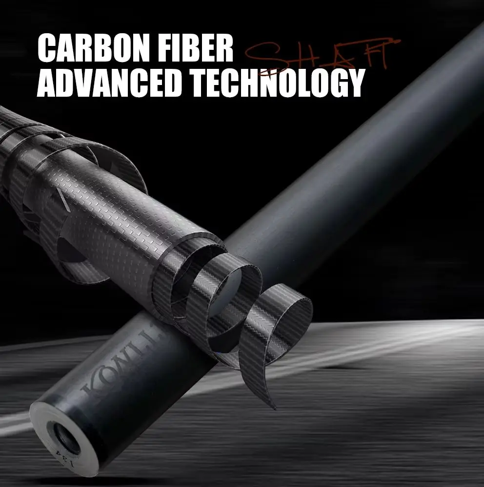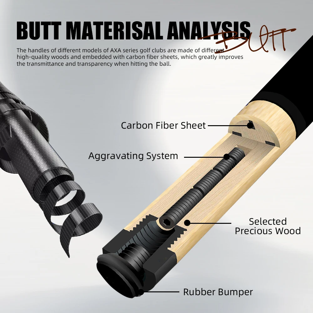 [High-strength carbon fiber]: The cross carbon fiber technology forelimb of the AXA series pool cues is made of carbon fiber composite materials with low deflection performance, and built-in shock-absorbing foam accessories, which not only makes the back handle power transmission efficient and lossless, but also effectively reduces the deviation when hitting the ball with high rotation, thereby achieving precise control and smooth and stable hitting experience. Secondly, the carbon fiber forelimb is harder than ordinary maple wood and has extremely high tensile strength, bending resistance, and scratch resistance.